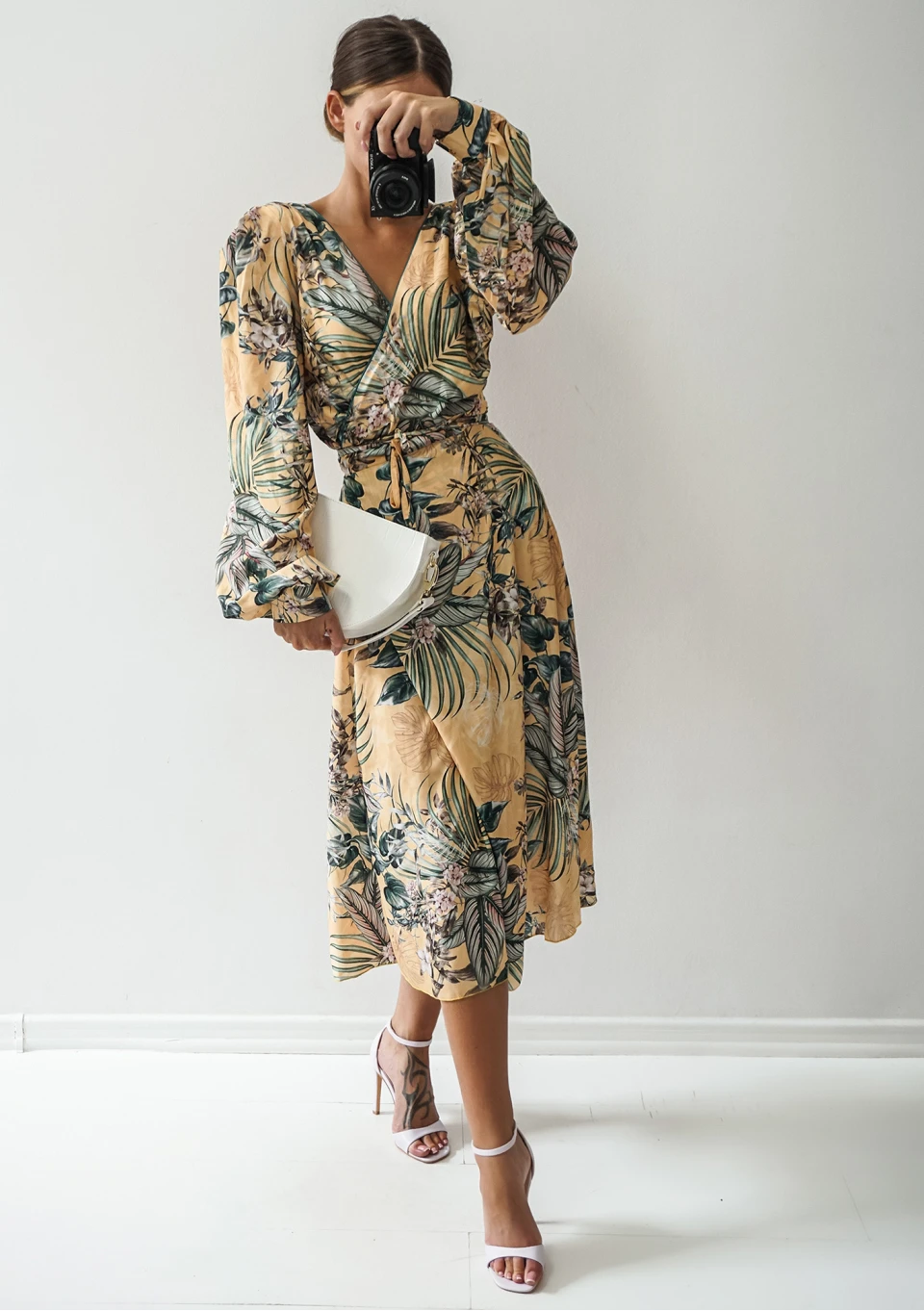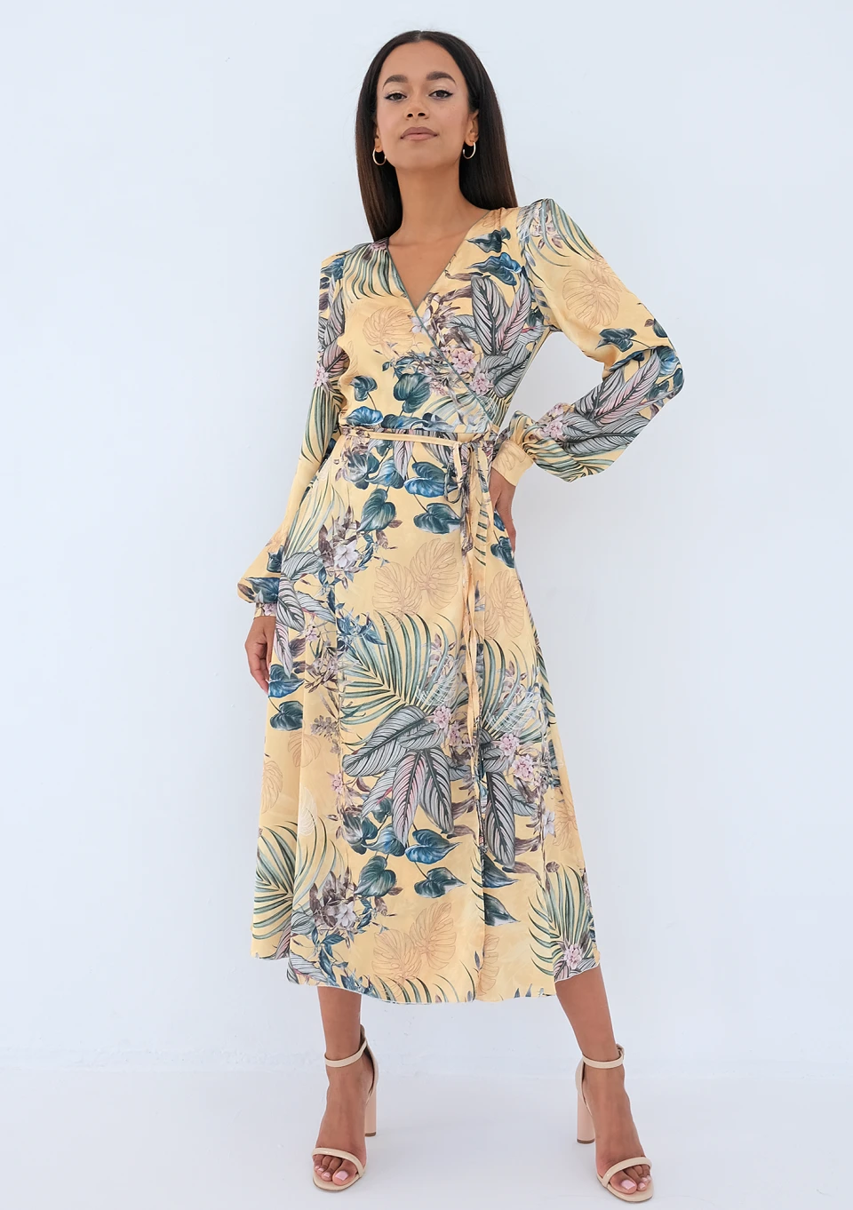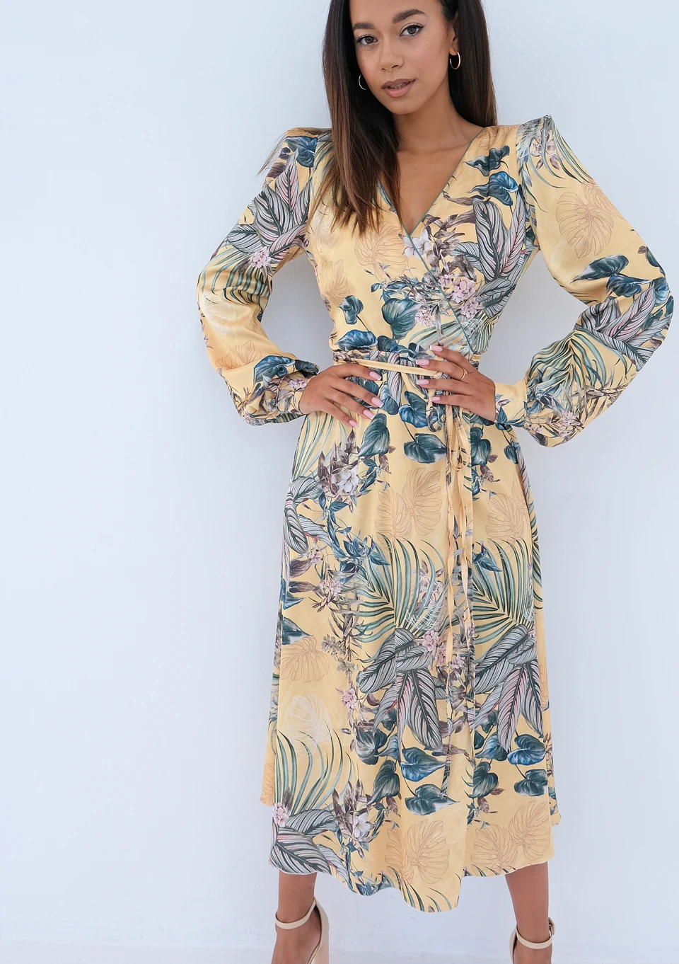 Jade - Kopertowa sukienka midi Yellow Leaves