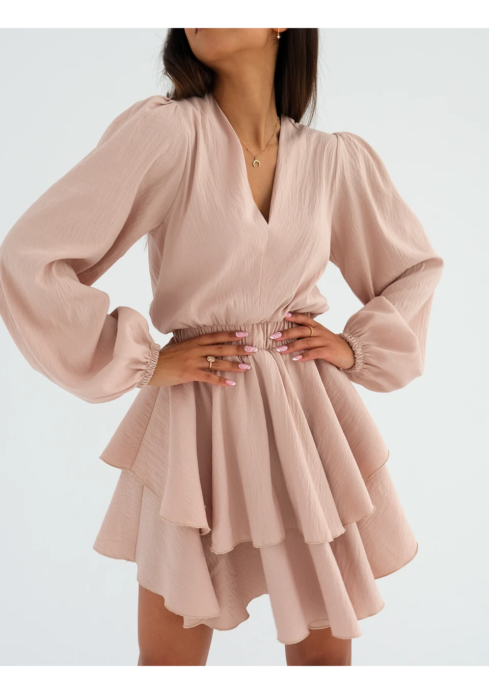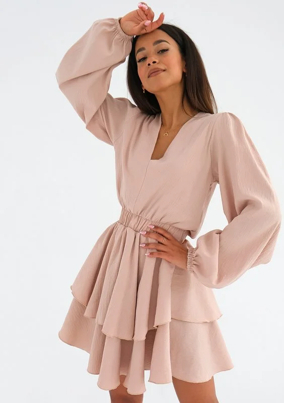 Pudrowa sukienka z rozkloszowanym dołem z dwóch kół i długim, luźnym rękawem. To lekka kreacja z eleganckim dekoltem w serek, wpisująca się w wiosenną aurę. Dzięki gładkości koloru pasuje do niej wiele dodatków.