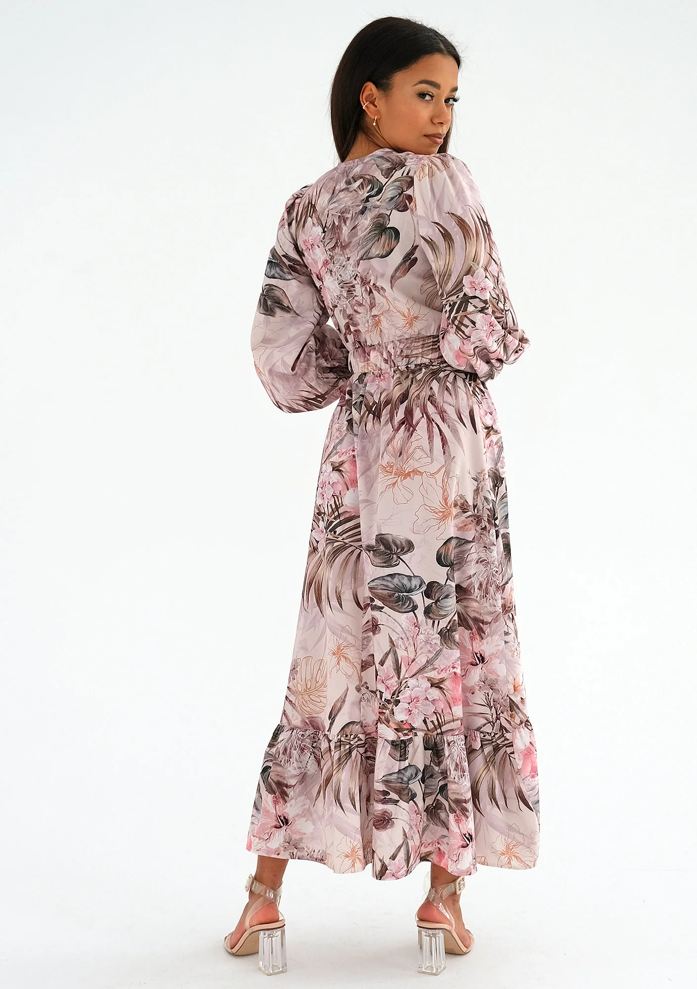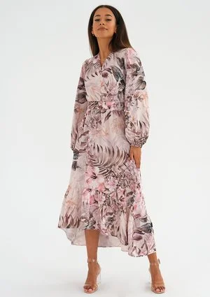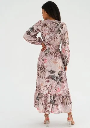 Valeria - Sukienka midi z falbaną Pink Flowers