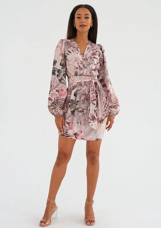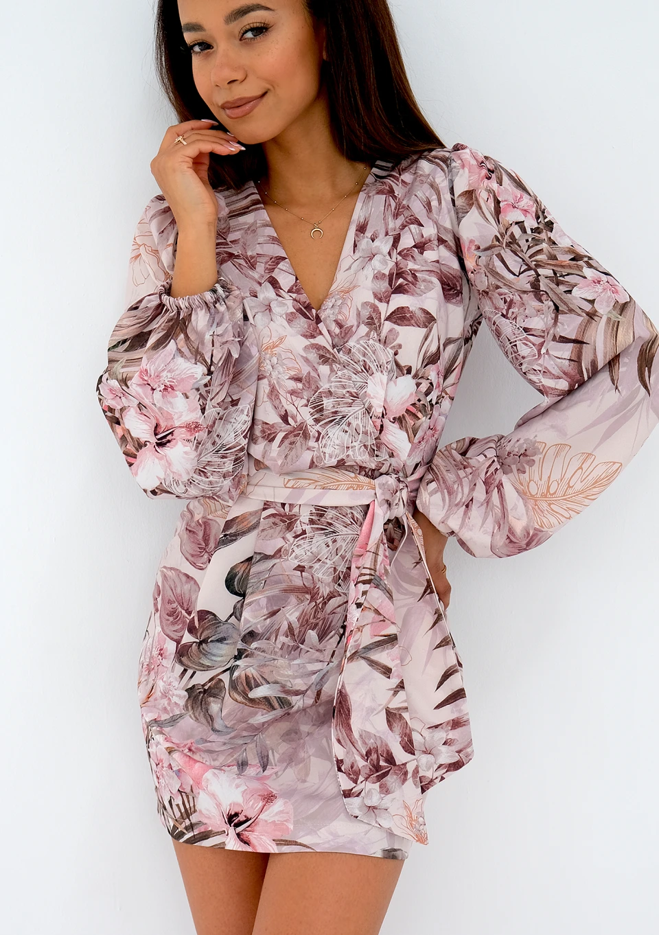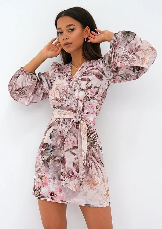 Elegancka sukienka mini o bogatym motywie kwiatów. Noemi jest subtelną kompozycją dopasowanego fasonu z kopertowym dekoltem i wiązaniem w talii. Całość równoważą długie, luźne rękawy wygodnie zakończone elastycznymi gumkami.