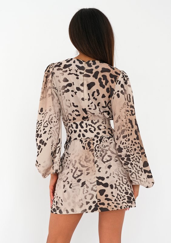 Elegancka sukienka mini w nieco drapieżnej odsłonie cętek to ponadczasowa kreacja dla kobiet chcących zaszaleć ze wzorem. Kopertowy dekolt, wiązanie zaznaczające talię i dopasowany fason zapewniają piękny zarys kobiecej sylwetki.
