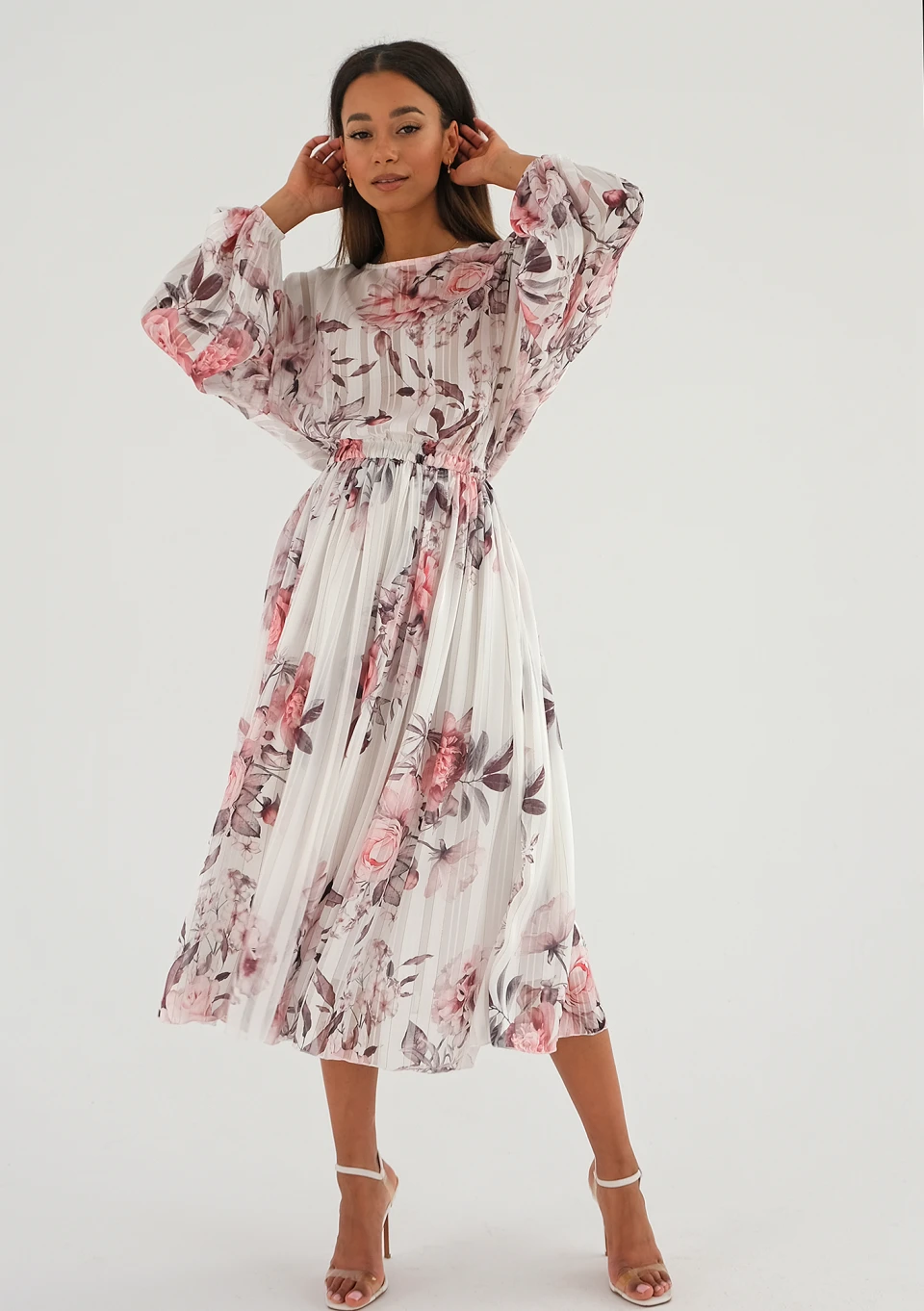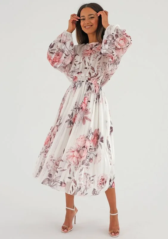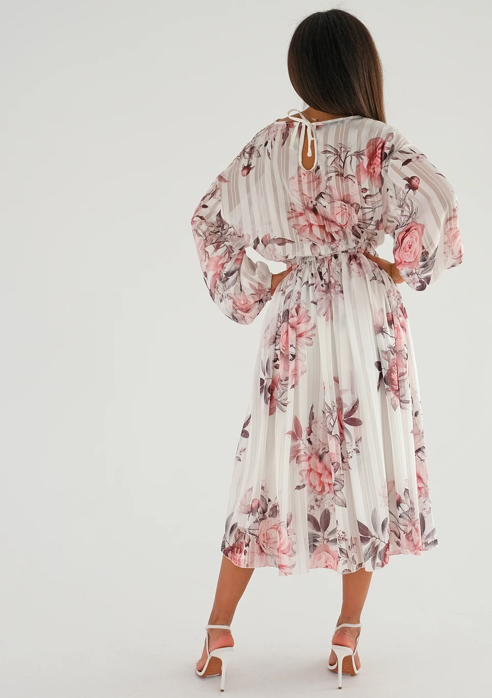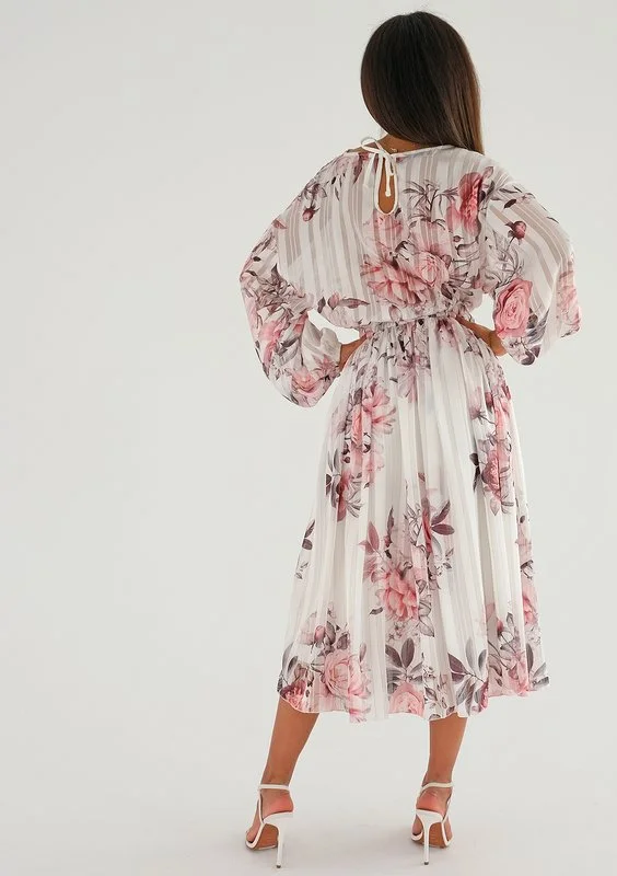 Elegancka sukienka midi to propozycja świeżej kompozycji kwiatów i półprzezroczystych prążków na wytwornym szyfonie. Zwiewna, lekka i subtelna, a zarazem wygodnie luźna. Uświetni wyjątkowe okazje, takie jak wesele, przyjęcia czy romantyczną kolację.