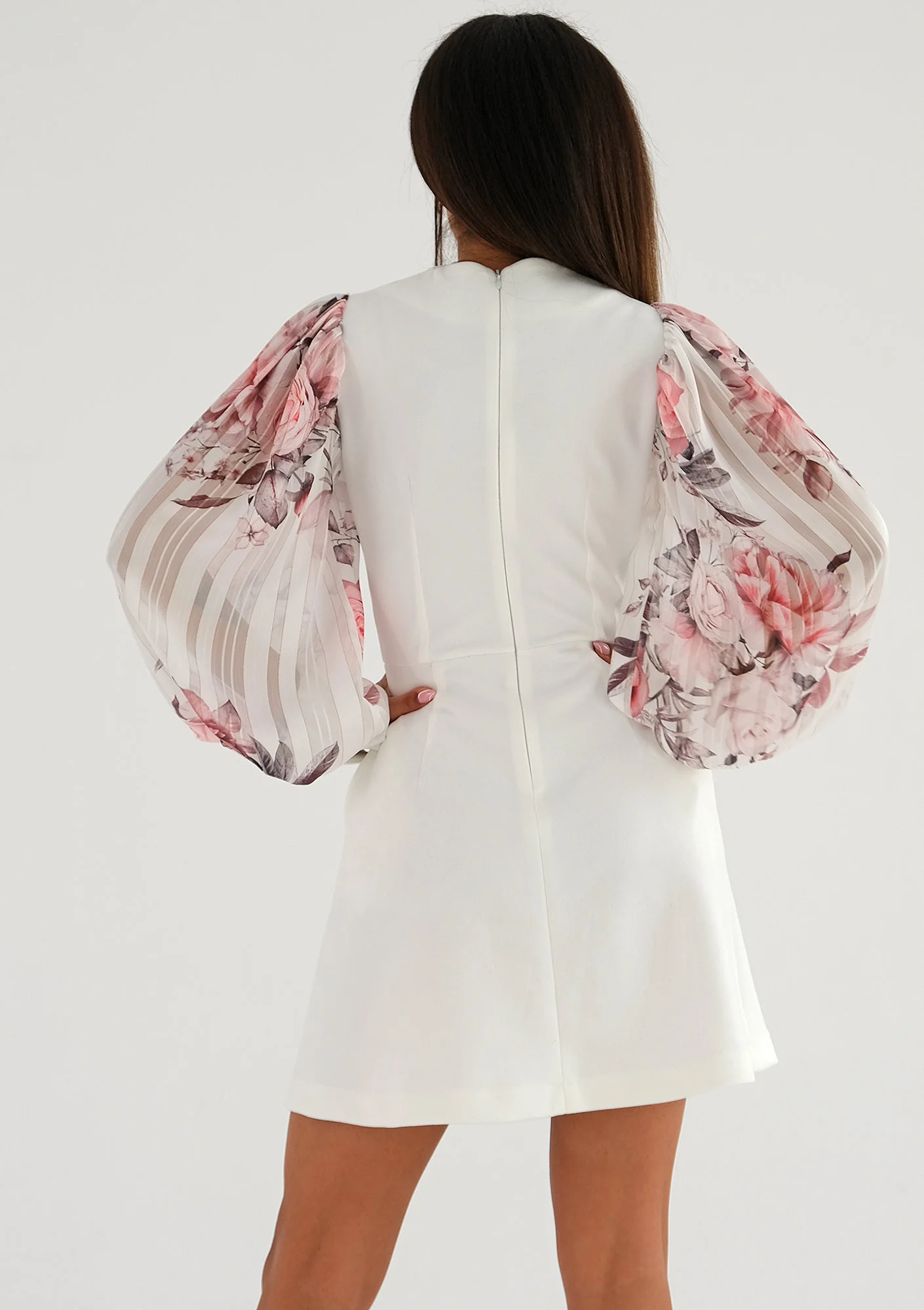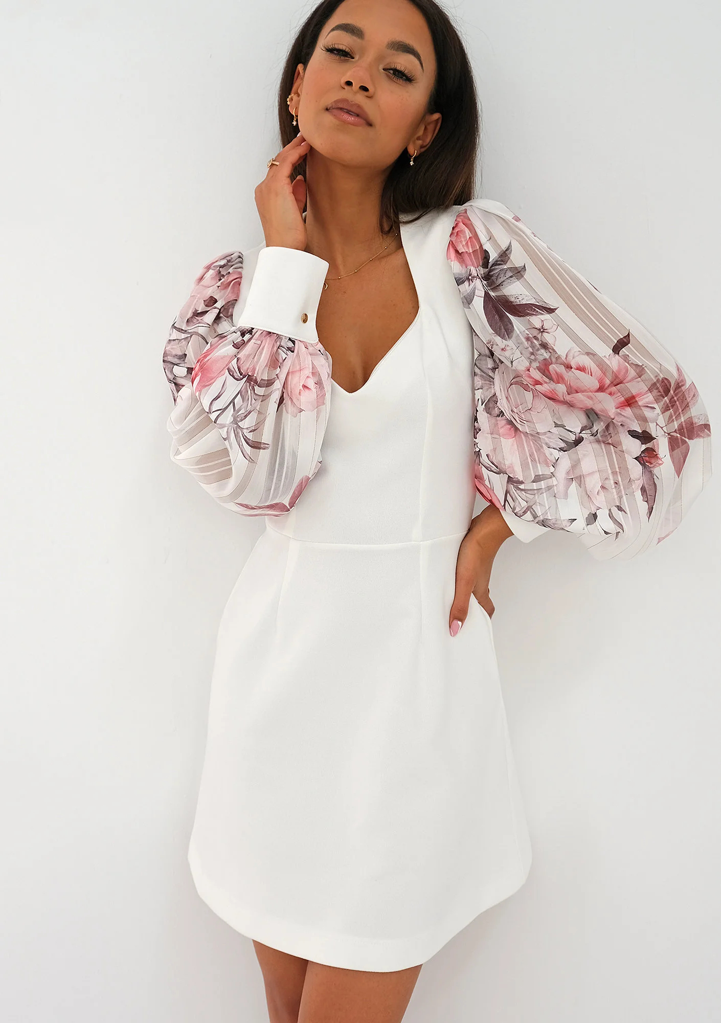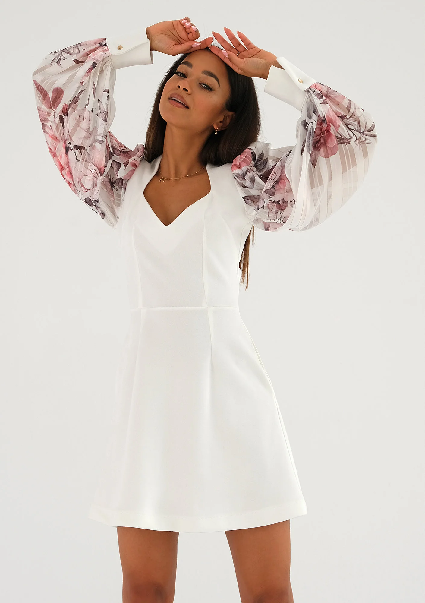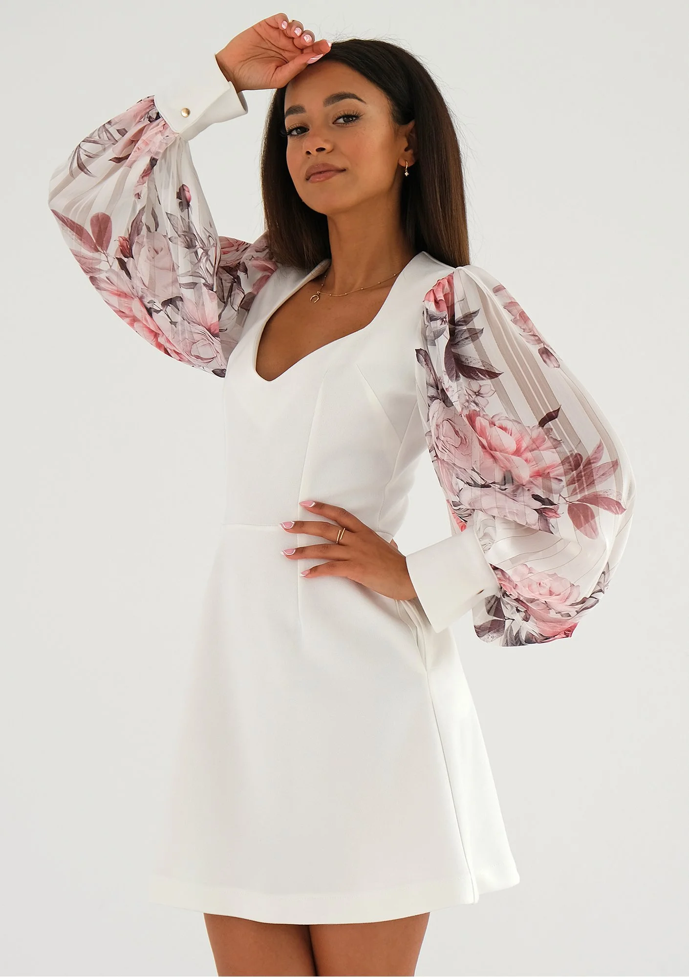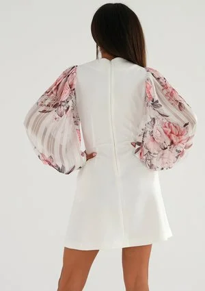 Biała sukienka mini to subtelna kreacja z ozdobnym rękawem, wykonanym z efektownego szyfonu. Materiał ten zachwyca różowym deseniem kwiatów i liści. Dodatkowego sznytu zadają detale: półprzezroczyste prążki i zapinane na metalowe napy mankiety. Nadia to propozycja bardzo romantycznej kreacji, która eksponuje nie tylko nogi. Dekolt karo odsłoni świetlistą skórę i kobiece wdzięki. Przy tak ponętnym kroju obowiązkiem zdaje się być dobranie eleganckiego łańcuszka i muśnięcie skóry migotliwymi drobinkami makijażu. To kreacja na wiele okazji – zmysłowa sukienka na randkę, sukienka na przyjęcie koktajlowe, jak i ważną imprezę jubileuszową lub rodzinną. Choć białe sukienki na wesele są zarezerwowane dla panien młodych, Nadia ze względu na długość mini i strojny rękaw zdaje się być również odpowiednia, jeśli wybierasz się na taką uroczystość w roli gościa.