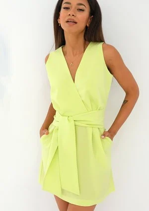 Fason mini, dopasowany, z kopertowym dekoltem, wiązaniem w talii, bez rękawów. Sukienka posiada kieszenie.