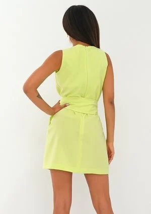 Dopasowane sukienki mini, jak żaden inny fason podkreślają kształty. Prezentowana kreacja rysuje kobiece linie dzięki zapinanemu na zamek, zwężonemu w talii kroju. Dodatkowym zdobieniem znakomicie pracującym na efekt kształtu klepsydry jest eleganckie wiązanie w talii. Sukienka posiada kieszenie i jest wykonana z komfortowo cienkiej, wysokoodpornej na gniecenie tkaniny. Modne sukienki naszej marki są projektowane i szyte w Polsce. Każdy model jest dostępny w rozmiarach z zakresu XS – L. Noela to fason dostępny aktualnie również w innych odcieniach fluo: pomarańczowym i różowym.