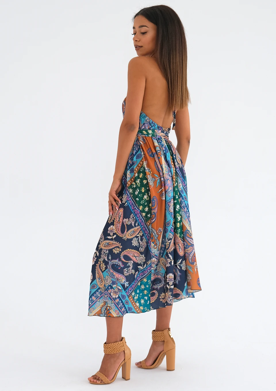 Luźna sukienka midi o najmodniejszym, apaszkowym wzorze. Wygodnie lekka, swobodnie opada na sylwetce. To sukienka z odkrytymi plecami, zmysłowo eksponująca ramiona.