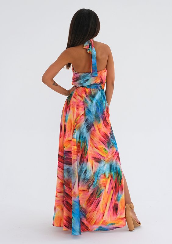 Fason maxi, z rozcięciem, z wiązanym na karku dekoltem typu halter. Sukienka posiada elastyczną gumkę w talii i na plecach.