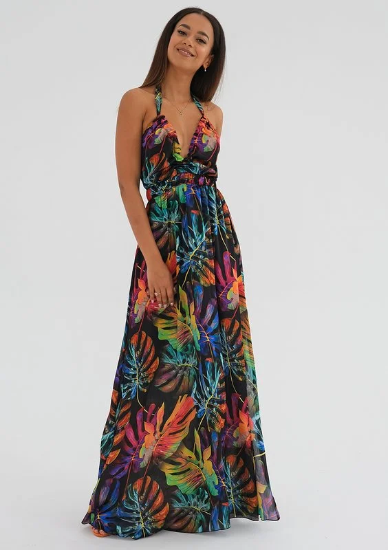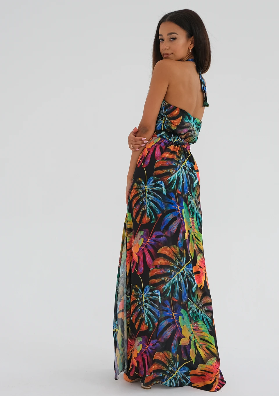 Fason maxi, z rozcięciem, z dekoltem wiązanym na karku. Sukienka posiada elastyczną gumkę.