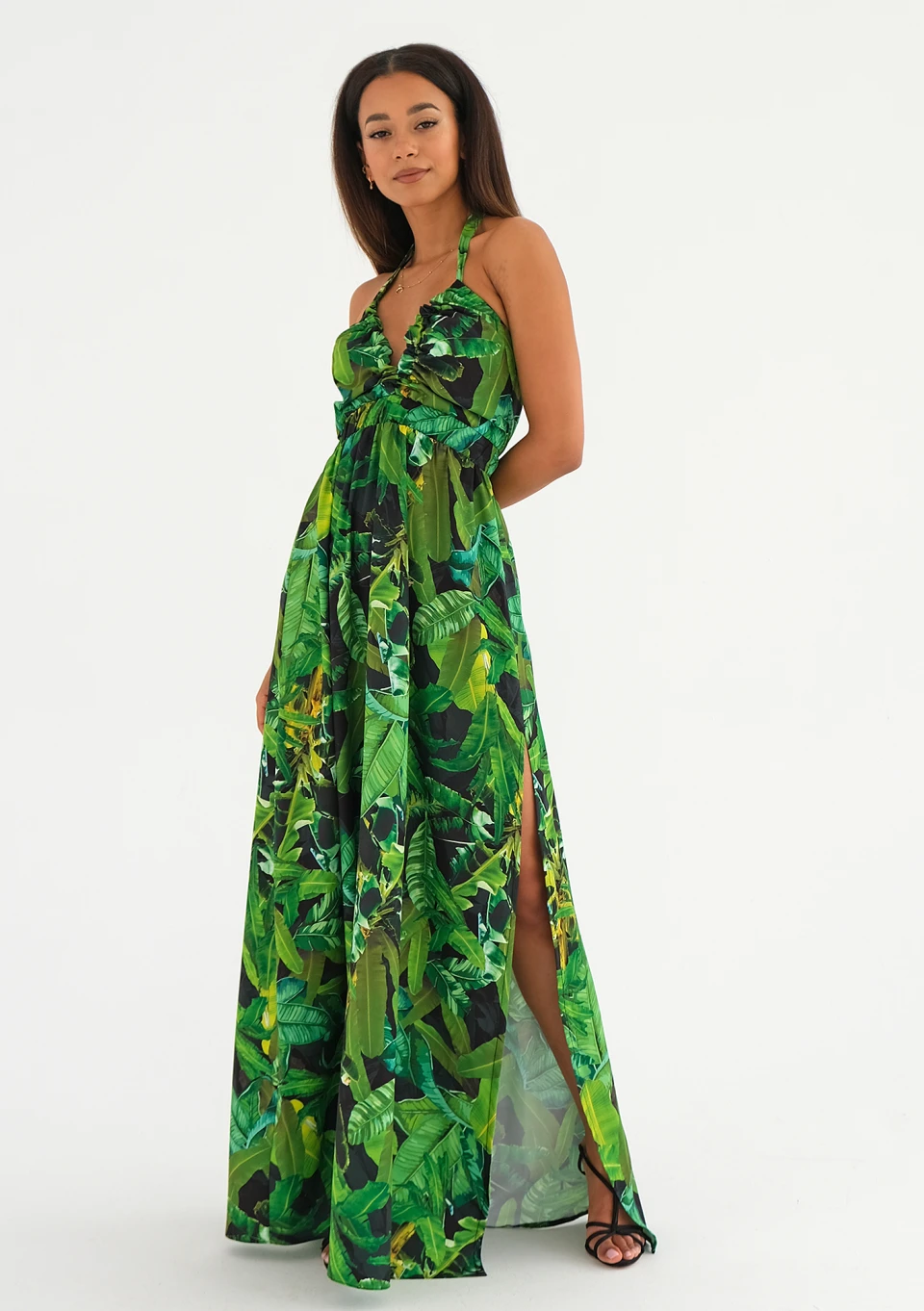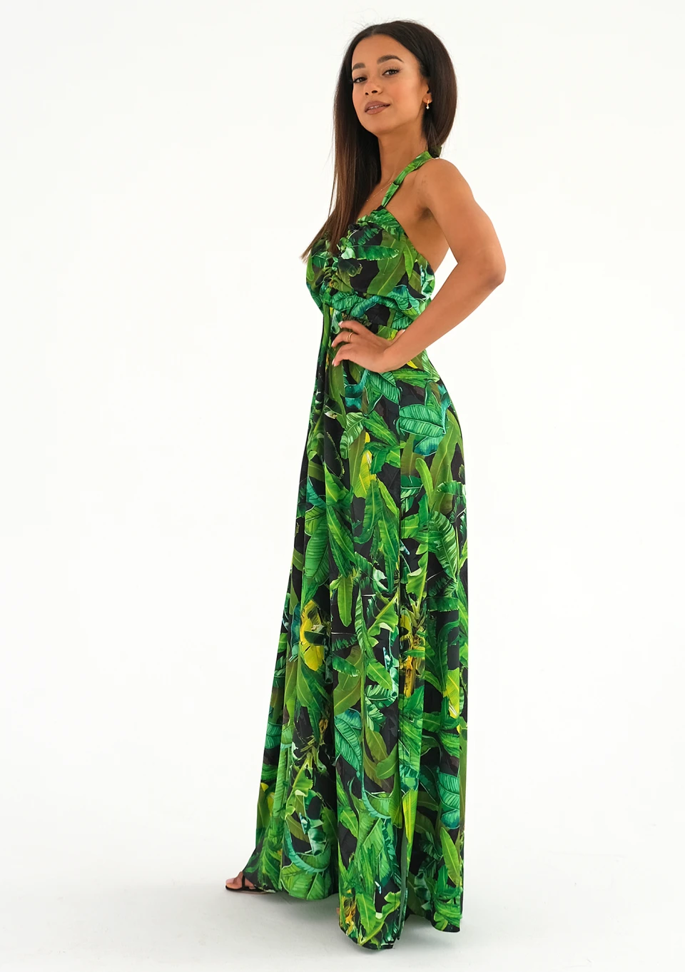 Długa sukienka na lato w liście o zwiewnym fasonie z rozcięciem. Kreacja z pięknie eksponującym dekoltem, odsłania także ramiona i plecy. Model w wakacyjnym stylu, odpowiedni na wiele codziennych, jak i wyjątkowych okazji.