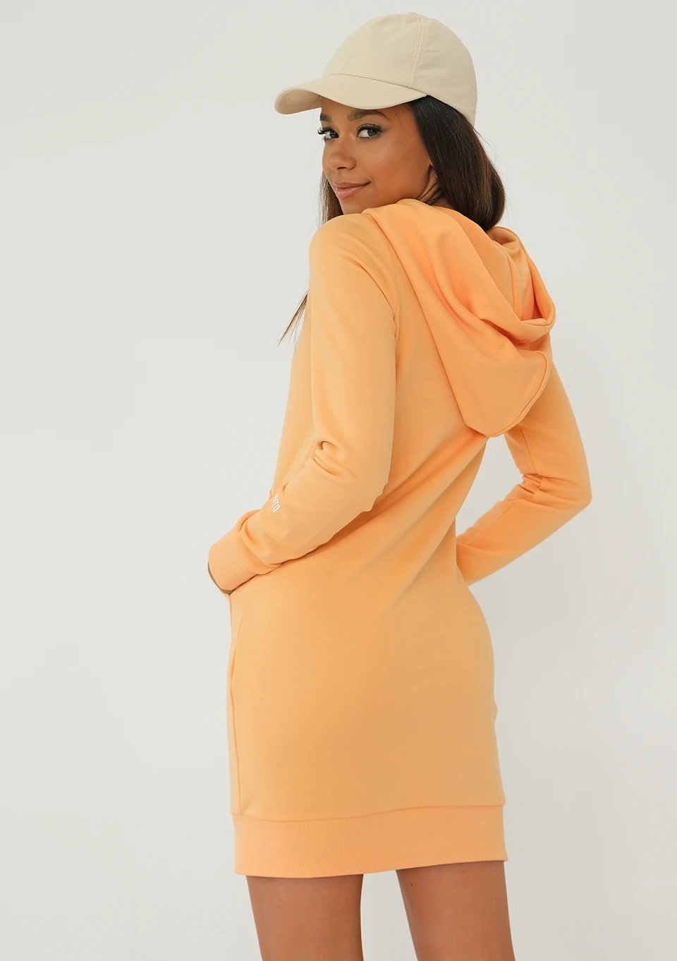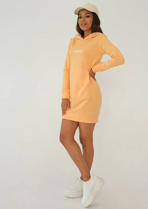 Sportowa sukienka z kapturem i kieszenią w najmodniejszym, pomarańczowym odcieniu. Posiada wygodny, dopasowany fason mini z długim rękawem. Model pozwoli Ci czuć się lekko i swobodnie na co dzień.