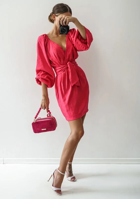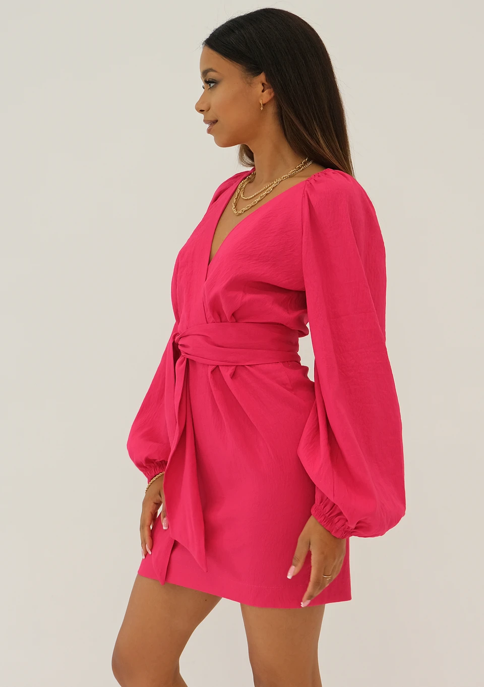 Różowa sukienka mini o kopertowym dekolcie, z wiązaniem w talii i długimi, osuwanymi na ramiona rękawami. Zmysłowy fason rysuje piękne proporcje sylwetki, eksponuje nogi, a także śmiało odsłania dekolt. W tej zniewalającej kreacji oczarujesz na randce, jak i weselu.