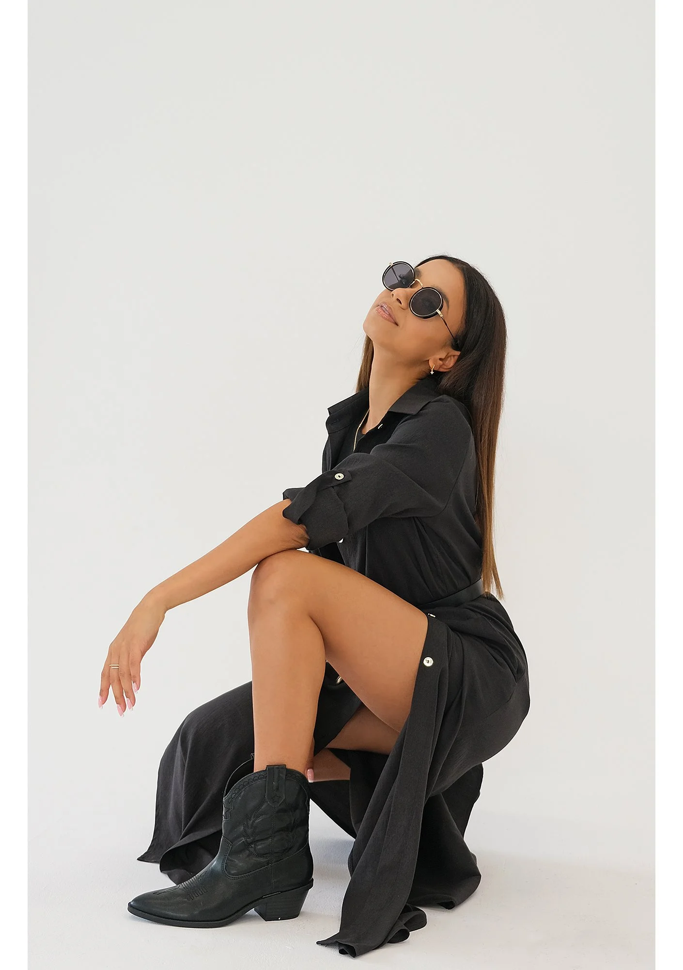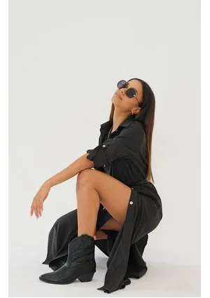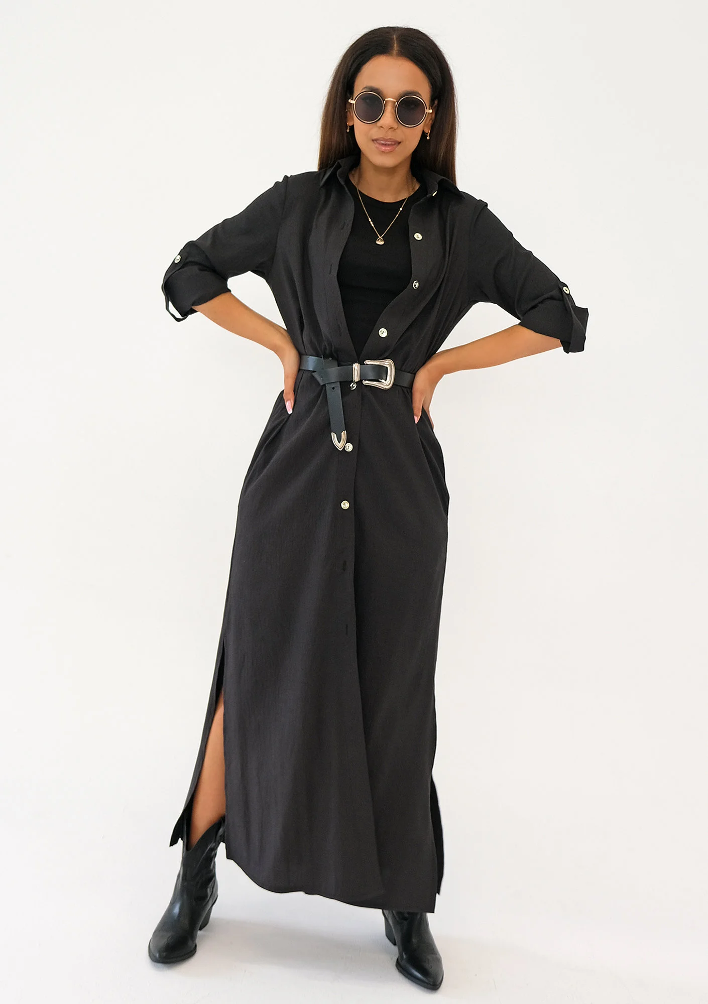 Zgłoś nielegalną treśćDla miłośniczek rockowego stylu Alicja Komar przygotowała wygodną kreację maxi, która stanowi doskonałą bazę efektownych stylizacji. To czarna sukienka koszulowa z długimi, podpinanymi rękawami i kołnierzykiem. Jest zapinana na guziki wzdłuż fasonu i posiada dodatkowe rozcięcia po bokach dodające jej lekkości. Zwiewna tkanina świetnie układa się na sylwetce i jest komfortowo przewiewna.