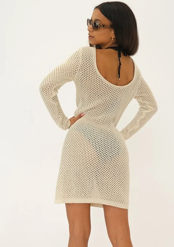 Sukienka plażowa mini o strukturze jednolitej siatki. Model dziany z naturalnej bawełny, idealny dla miłośniczek nadmorskich wakacji i relaksu przy basenie.