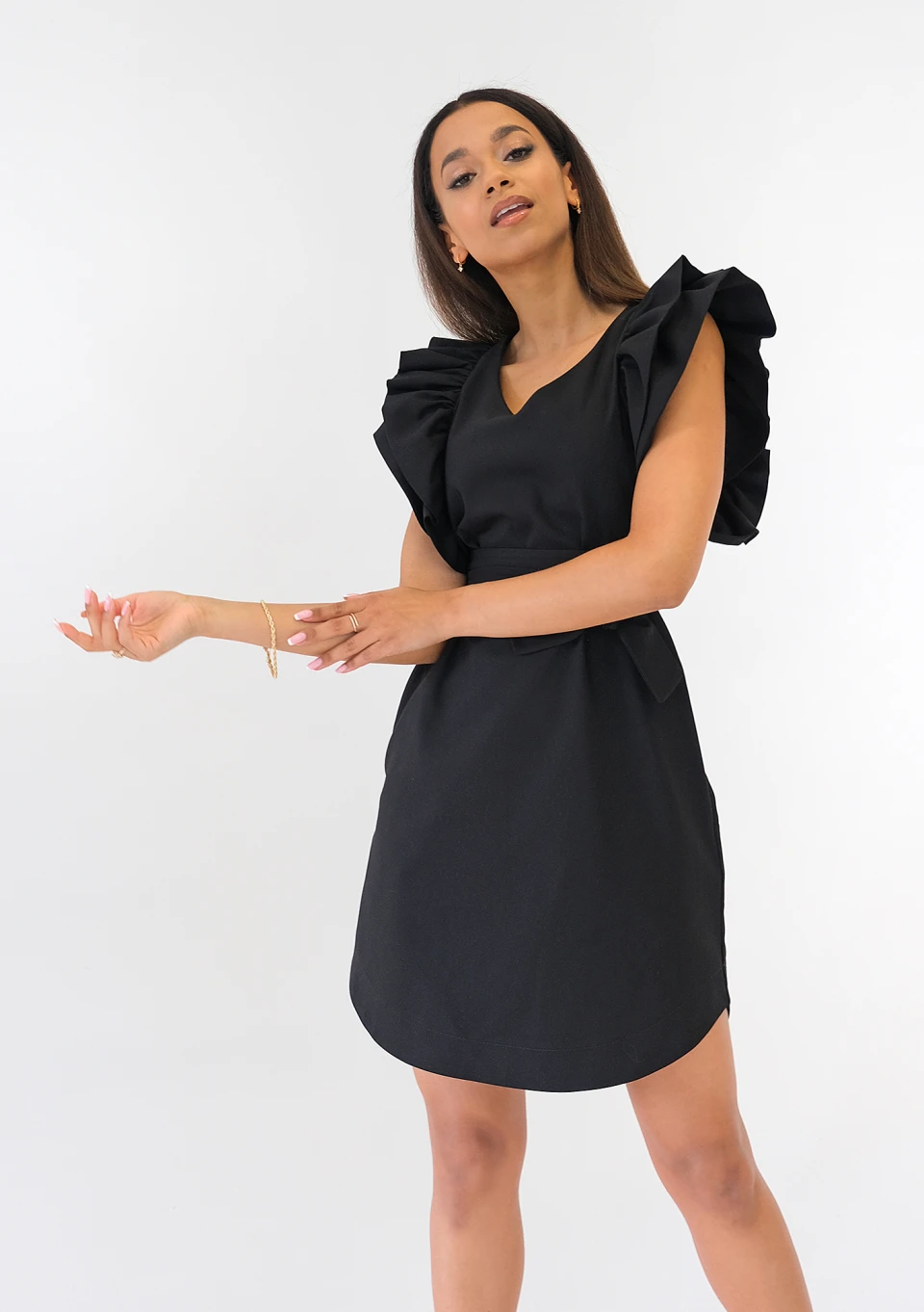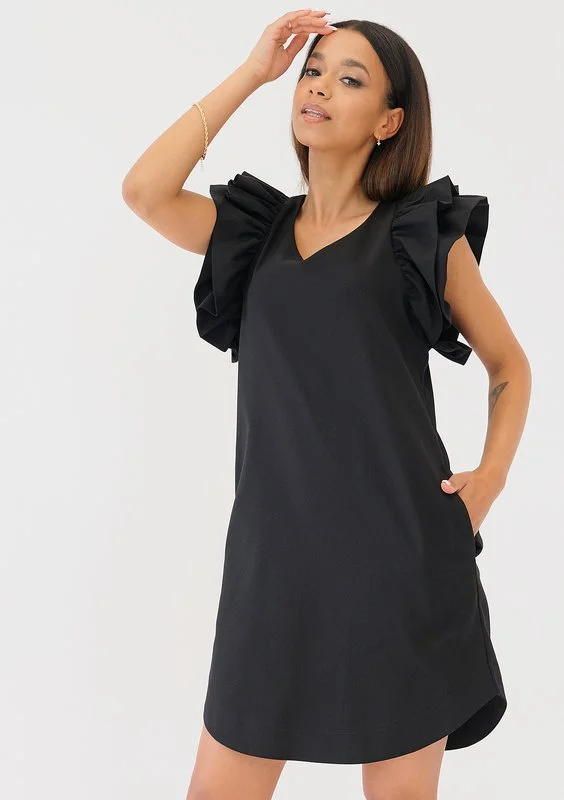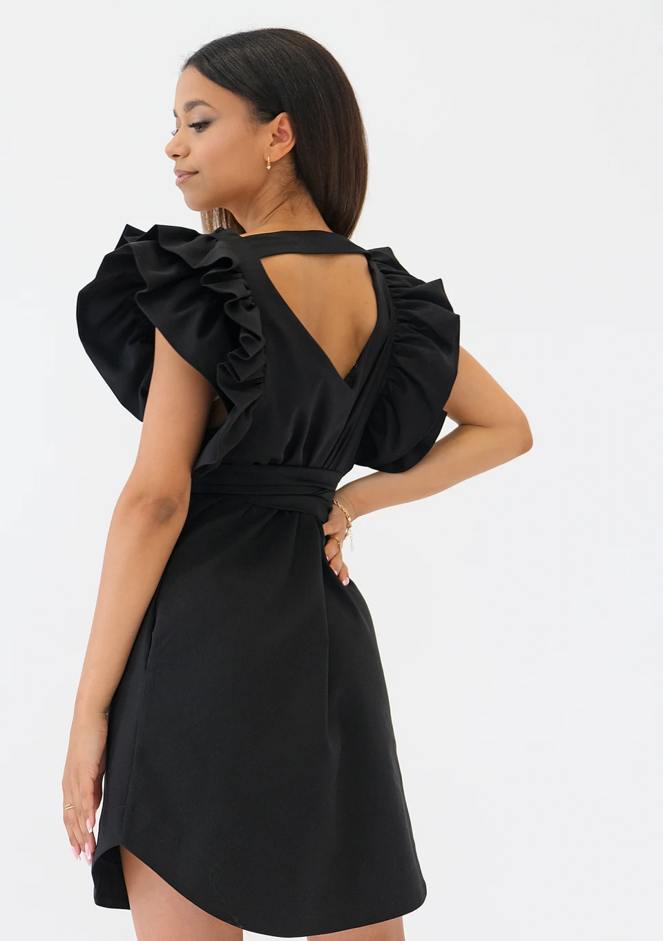 Elegancka mała czarna, urozmaicona falbankami i wycięciem na plecach. To sukienka o wszechstronnym i wygodnym kroju z kieszeniami, który zapewnia wielość stylizacji. Możesz nosić ją w luźnej formie lub obwiązując talię dołączoną tasiemką, a całość zwieńczać różnymi dodatkami.