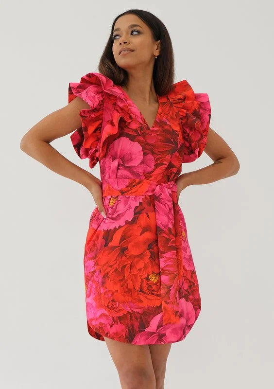 Elegancka sukienka w kwiaty, zwieńczona urokliwymi falbankami na ramionach i wycięciem na plecach. W okazałości swoich ozdób zachowuje praktyczny i wygodny krój. Posiada kieszonki i prostą formę, którą możesz przewiązać tasiemką.