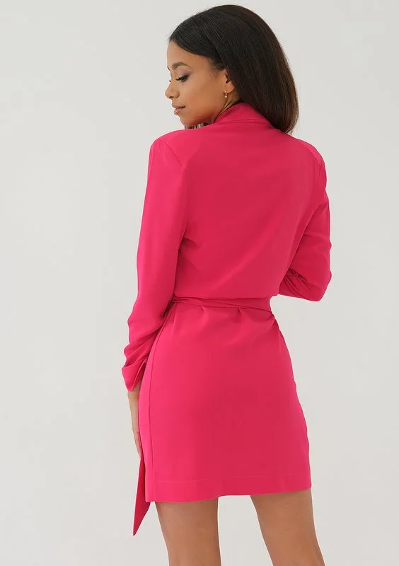 Fason mini, kopertowy, z kołnierzem, długimi rękawami z poduszkami na ramionach i wiązaniem w talii. Na mankiecie eleganckie marszczenie.