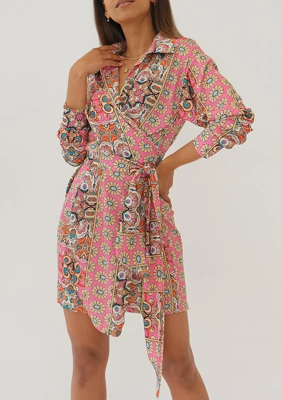 Różowa sukienka kopertowa mini o bogatej kompozycji wzoru, wykonana z eleganckiej tkaniny o satynowym wykończeniu. Kreacja oczarowuje kobiecą formą z szykownym kołnierzem i wiązaniem, dzięki któremu zaznacza talię.
