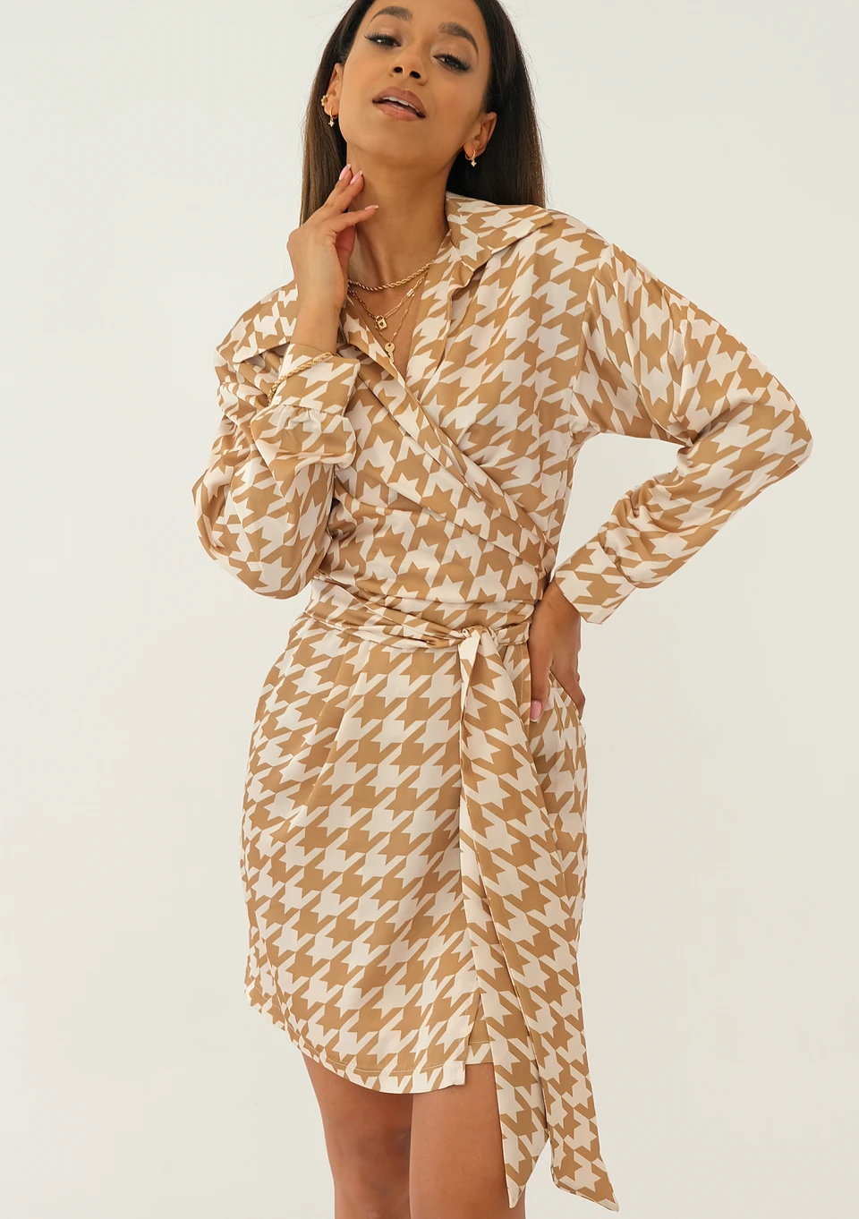 Suzie - Kopertowa sukienka Beżowa Pepitka