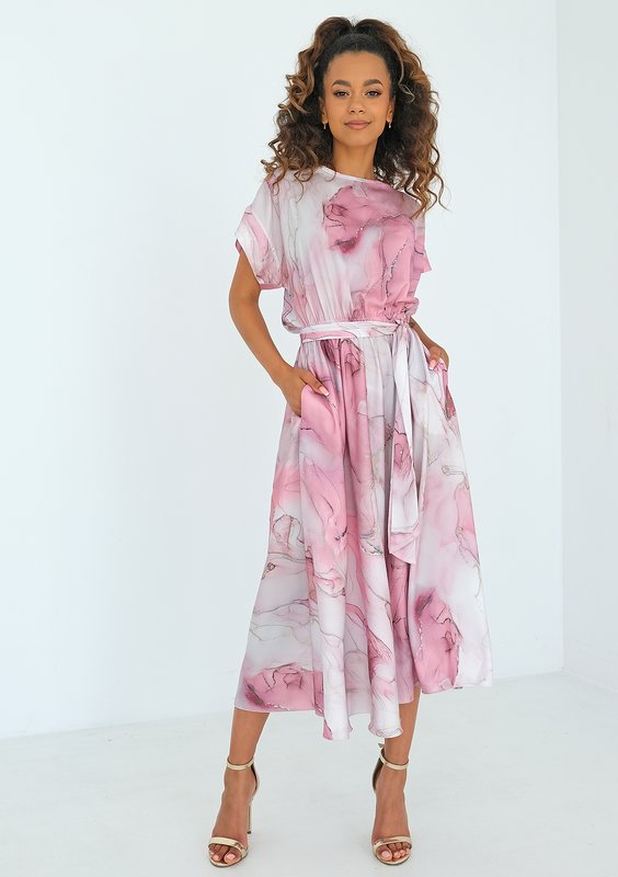 Rozkloszowana sukienka midi o plamistym wzorze minerału łączy w sobie jasne duo różu i bieli. Kreacja posiada kieszenie i wygodnie luźny fason, który przysłuży się każdej sylwetce, maskując jej niedostatki. To sukienka z krótkim rękawem i gumką w talii, wykonana z elegancko gładkiej tkaniny.