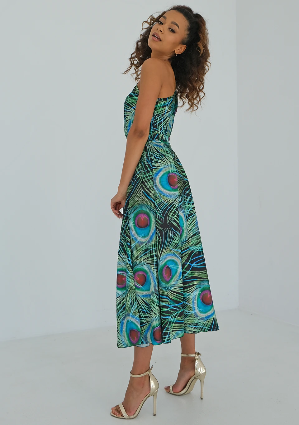 Elegancka sukienka midi o mocno rozkloszowanej formie. Niepowtarzalny urok kreacji to rezultat motywu pawich piór i satynowego wykończenia tkaniny. Sukienka zada szyku przy wyjątkowych okazjach na weselu, romantycznej randce, jak i na spacerze po wakacyjnym resorcie.