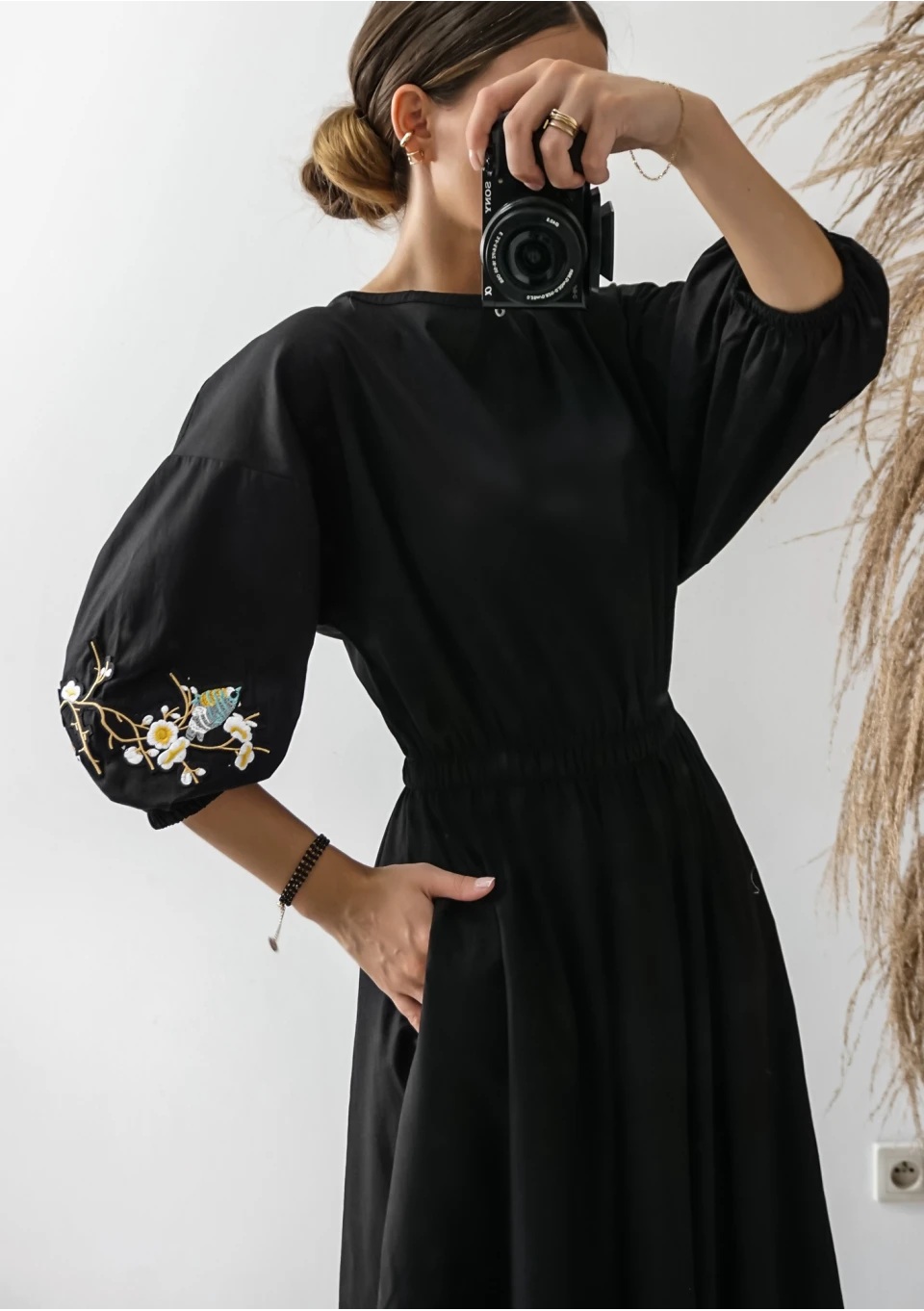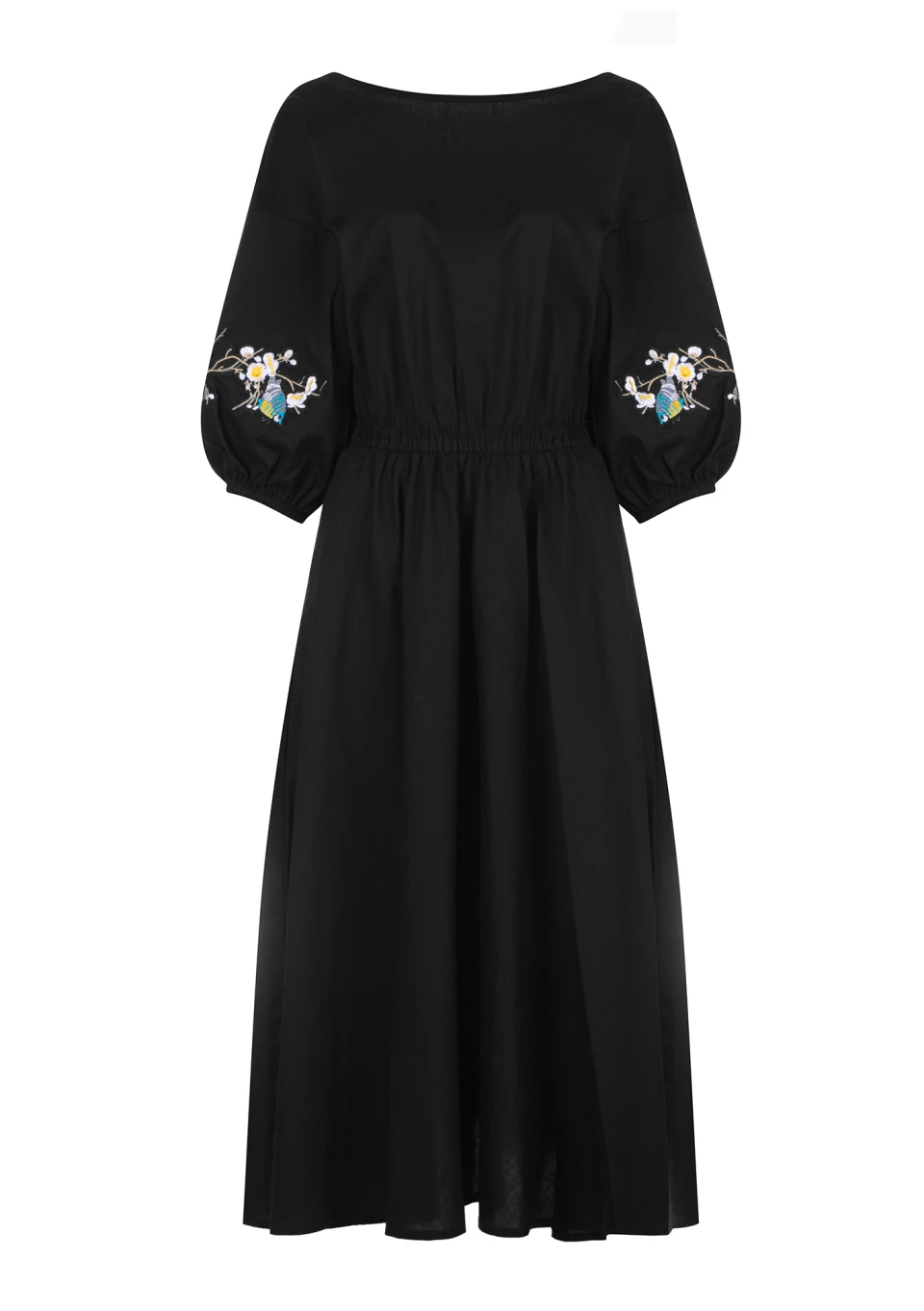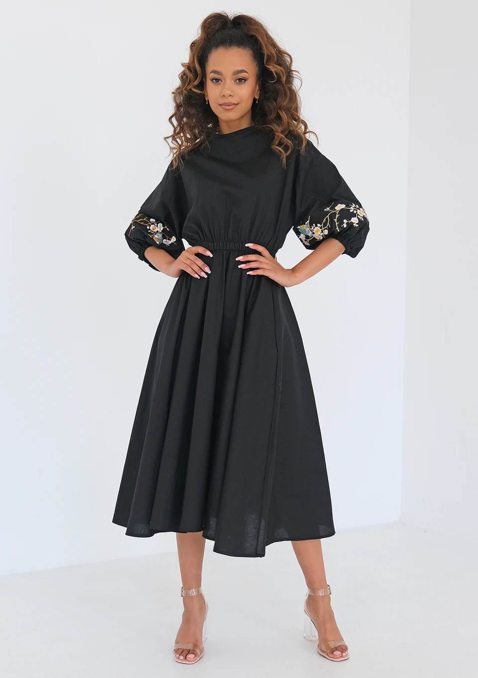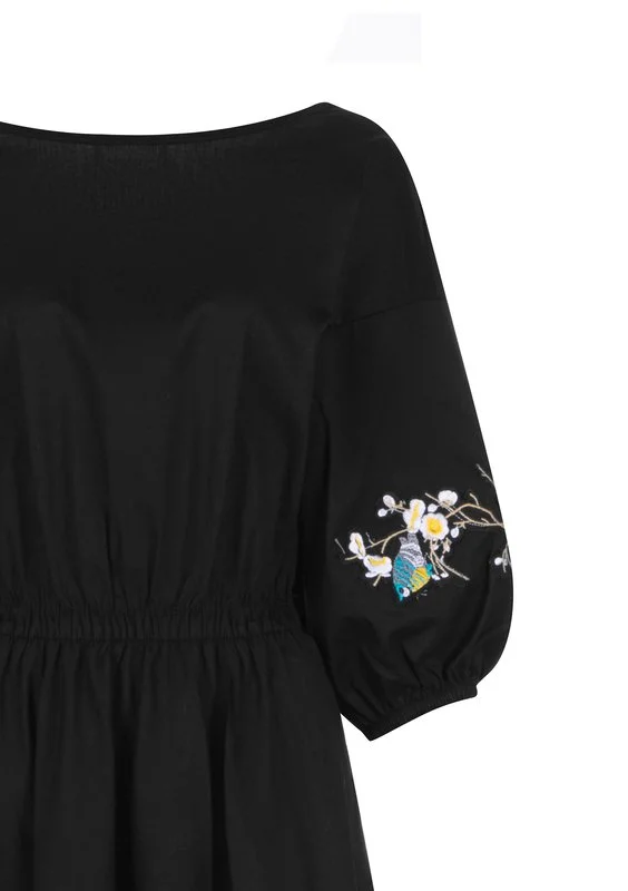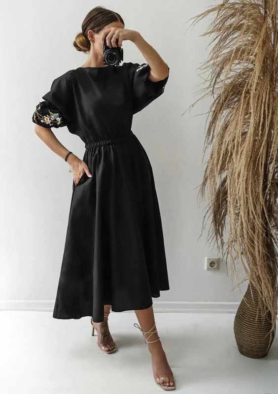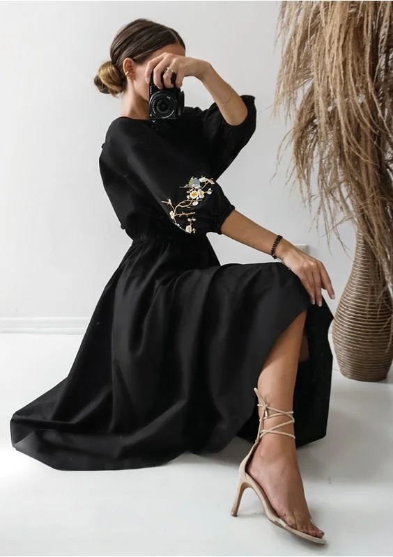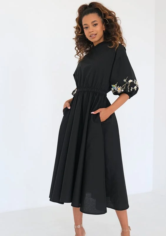 Rozkloszowana sukienka bawełniana jest elegancką kreacją midi na codzienne, jak i większe okazje. To model w uniwersalnej czerni, minimalistycznie zdobiony haftami na rękawach.