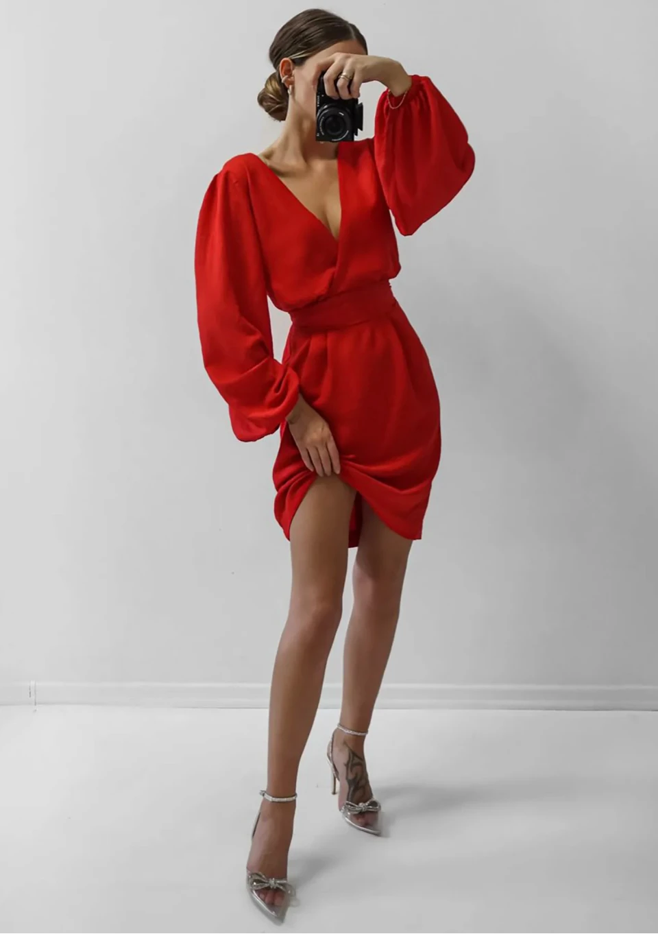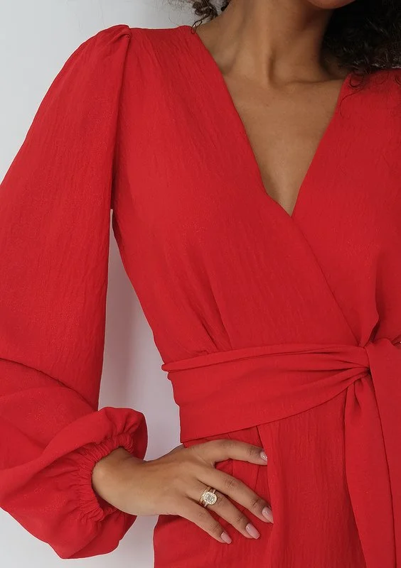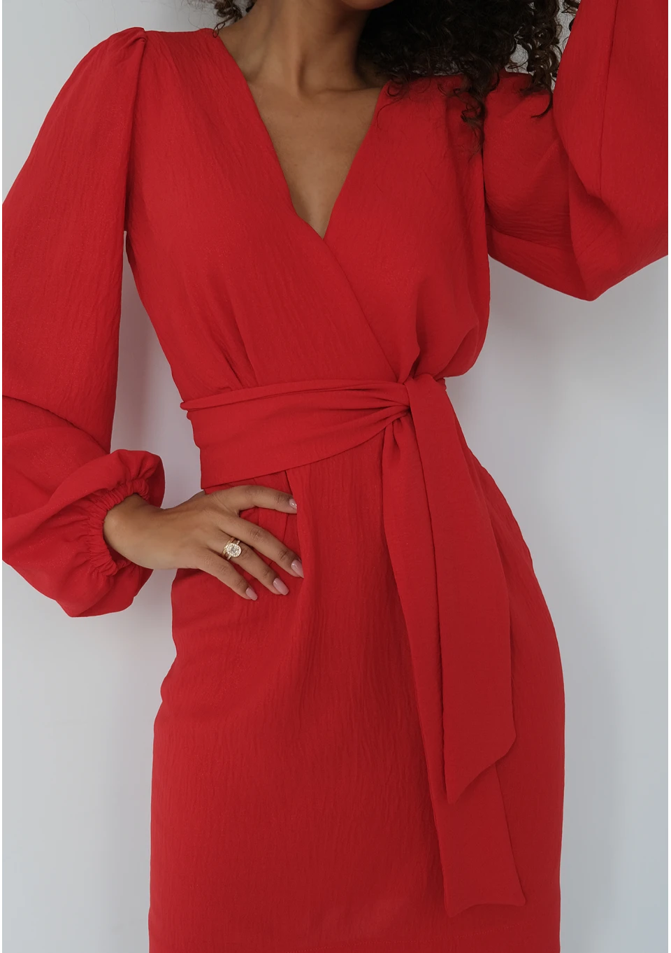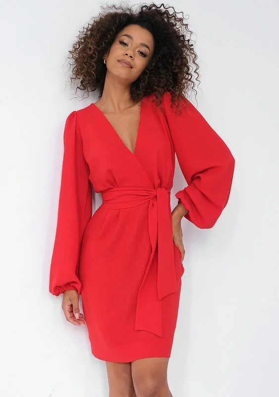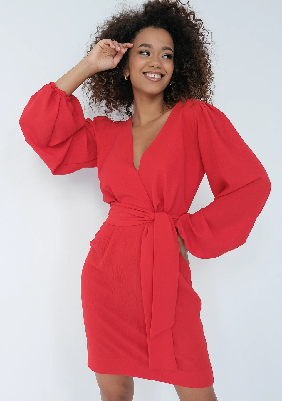 Elegancka mini w zmysłowej czerwieni to sukienka na wiele wyjątkowych okazji. Pięknie skrzy, zachowując ponadczasowy umiar efektu. Dopasowany fason zarysowuje linie sylwetki, eksponując kobiece atuty kopertowym dekoltem i wiązaniem wokół talii.