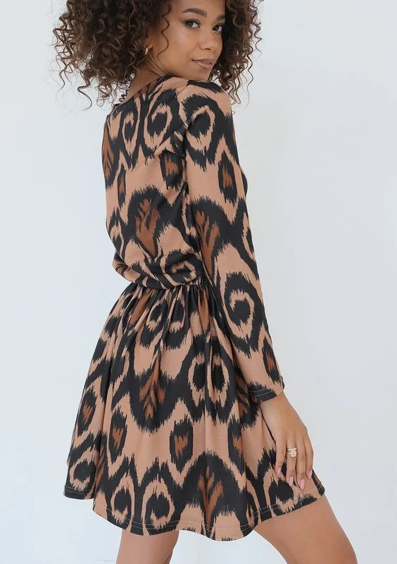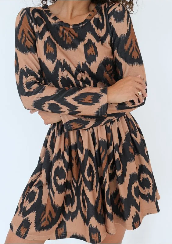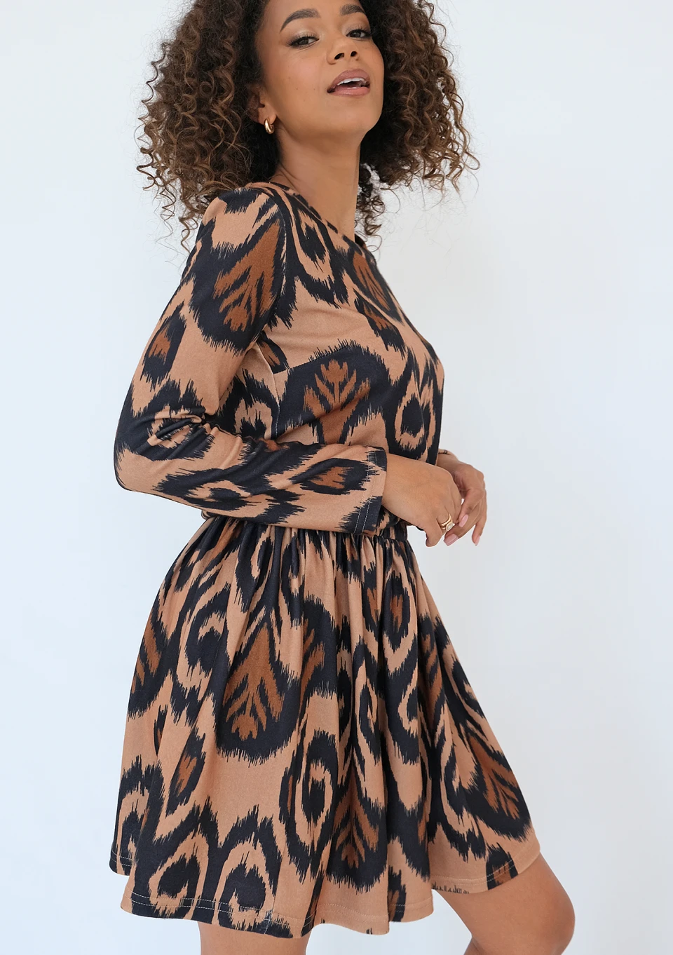 Brązowa sukienka mini z długim rękawem i rozkloszowaną spódniczką, wykonana z przyjemnie miękkiej dzianiny. Żaden inny fason nie dorównuje jej pod względem wygody i wszechstronności! Model zdobi wyrazisty print, świetnie wpisujący się w jesienno - zimowe trendy.