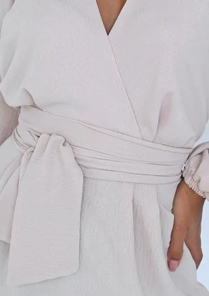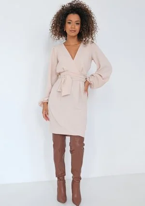 Fason mini, dopasowany, z kopertowym dekoltem, wiązaniem w talii i długim, luźnym rękawem.