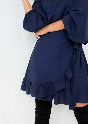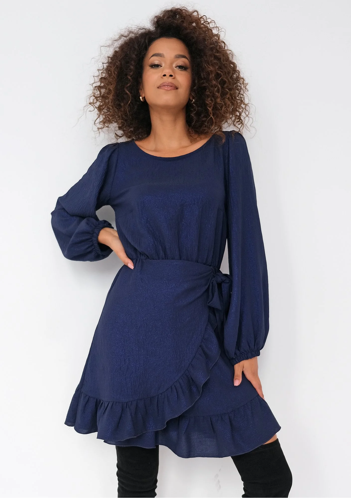 Granatowa sukienka z długim rękawem została wygodnie skonstruowana – to lekko rozkloszowany model z elastyczną gumą w pasie, przysłonięty zakładką z elegancką falbanką. Kreacja pięknie się mieni dzięki drobnemu pyłkowi tkaniny.