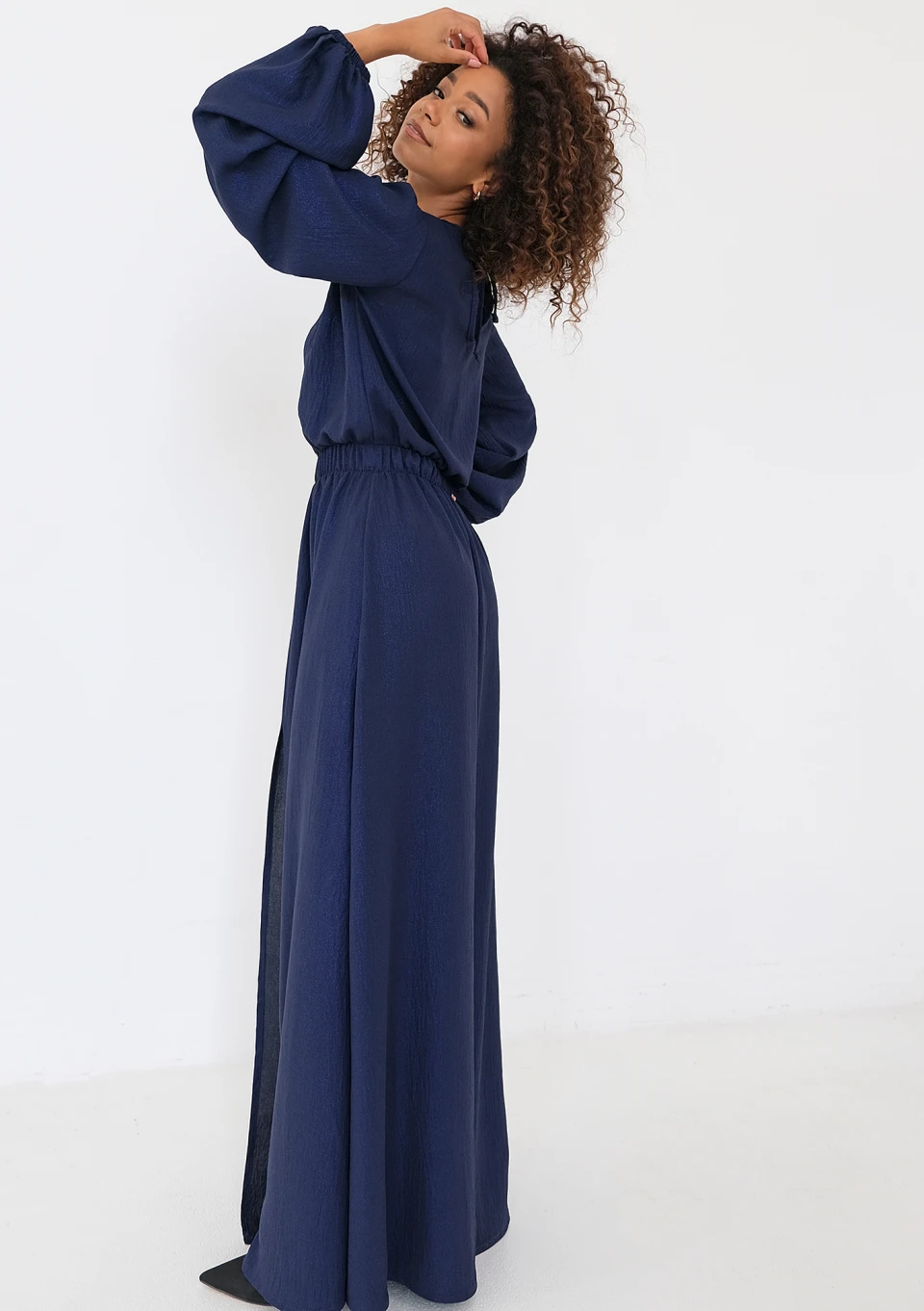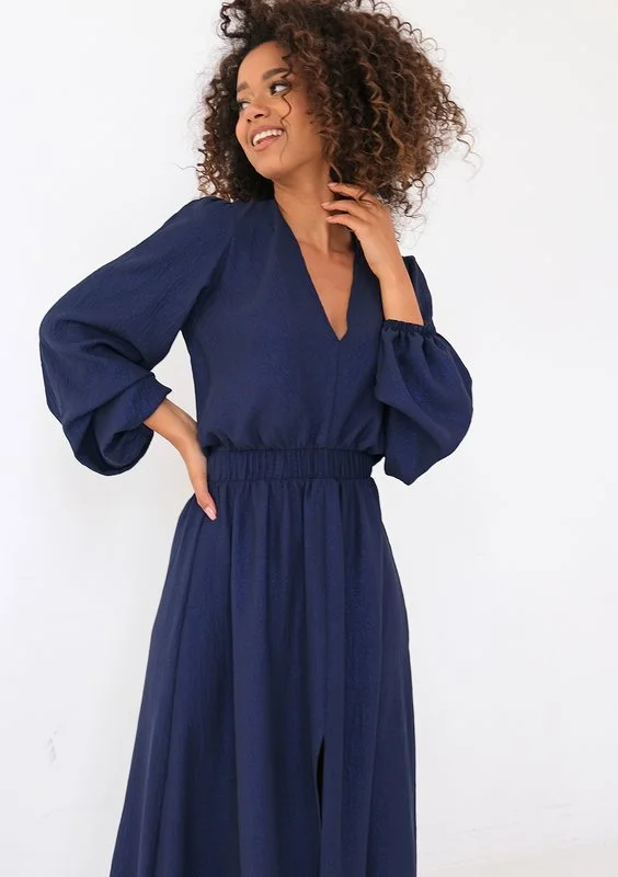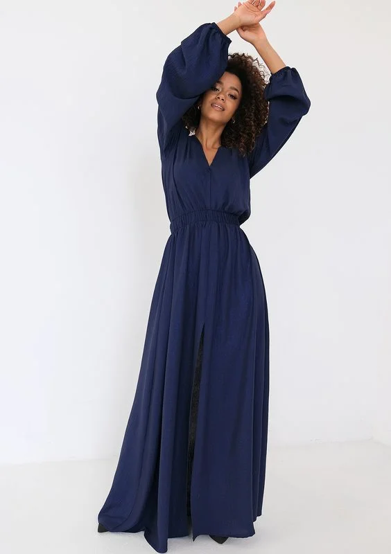 Granatowa sukienka maxi wykonana ze zwiewnej tkaniny, na której pięknie skrzy się drobny pyłek. Głębokie rozcięcie i dekolt w kształcie serka zapewniają lekki efekt. Dzięki wygodnej i minimalistycznej formie znajdziesz wiele okazji do jej założenia.