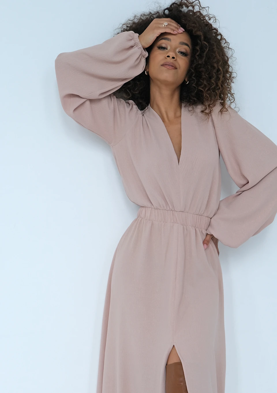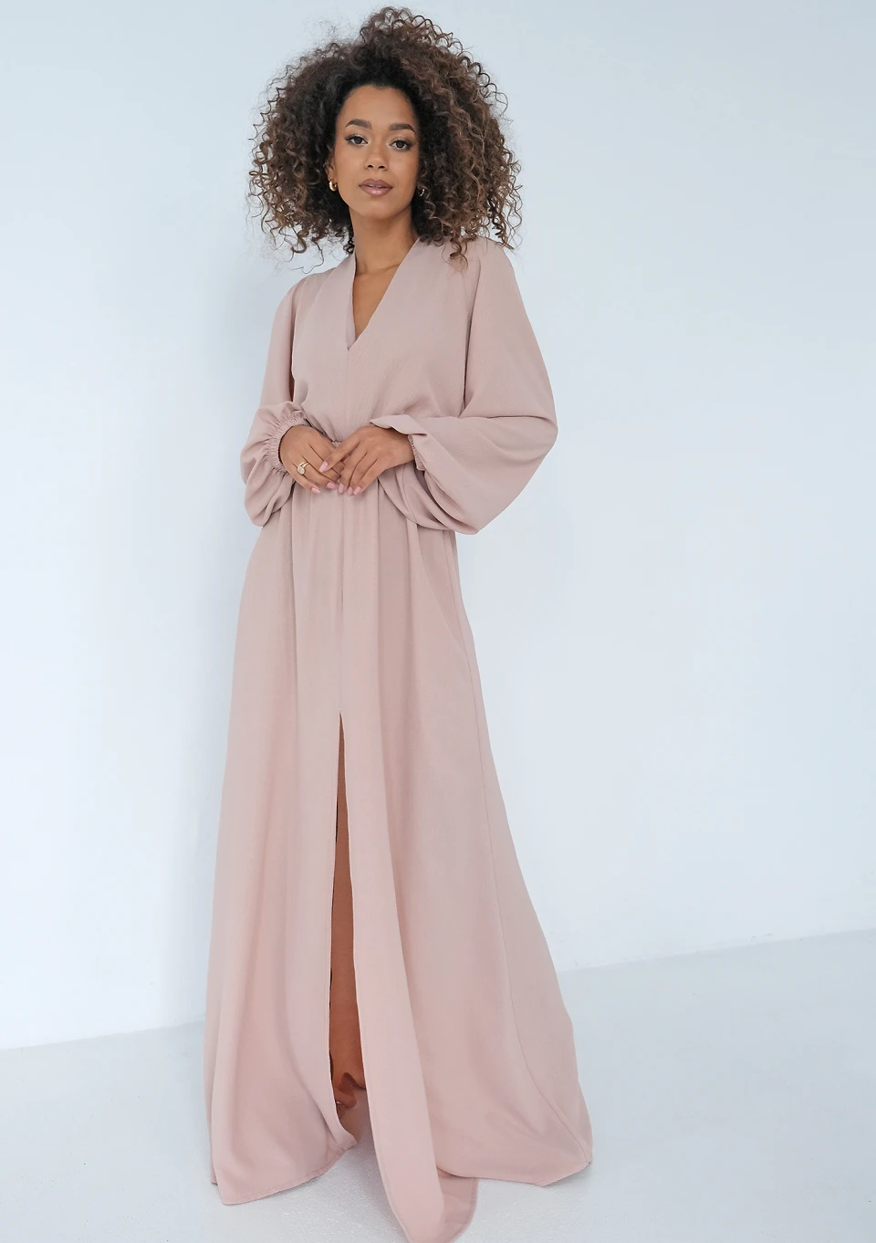 Fason maxi, luźny, z rozporkiem, z długimi rękawami i elastyczną gumą w talii. Dodatkowa wstążka do zawiązania.