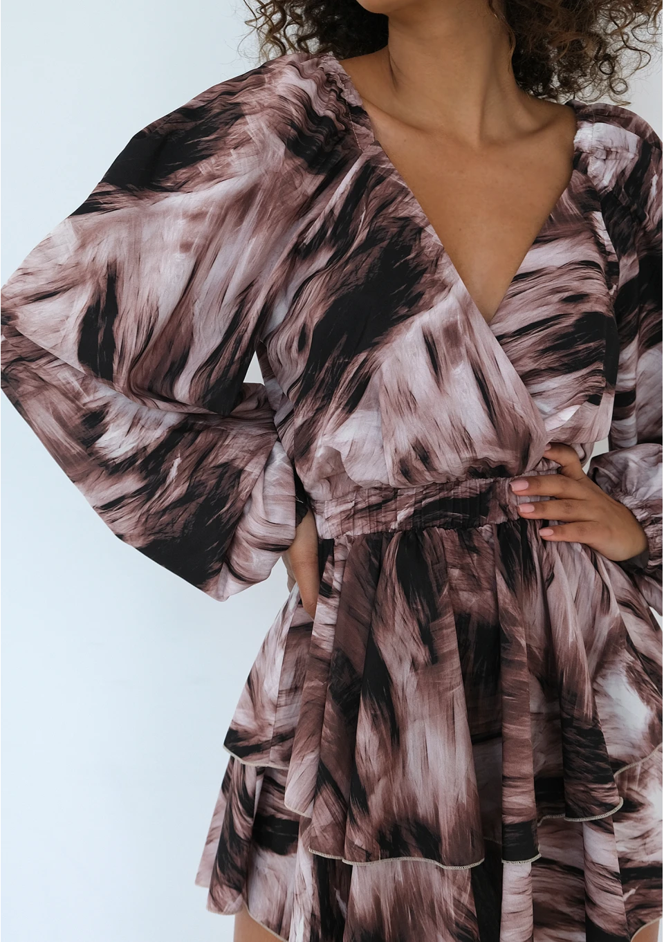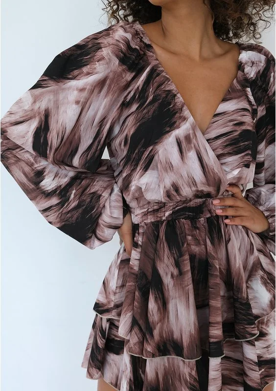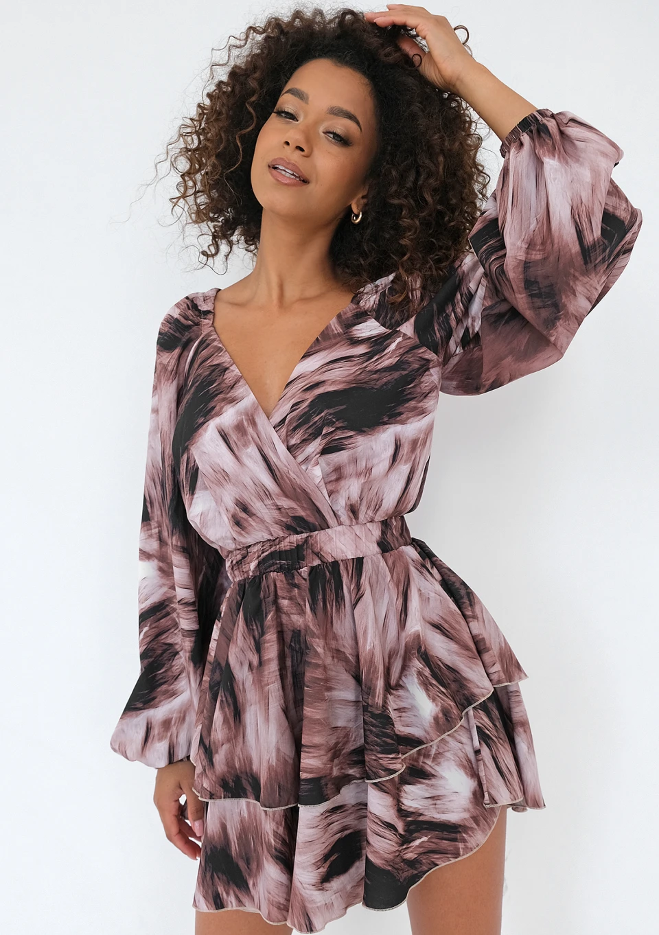 Rozkloszowana sukienka mini z kopertowym dekoltem i długim rękawem. Kreacja zachowana w jesiennej kolorystyce brązu.