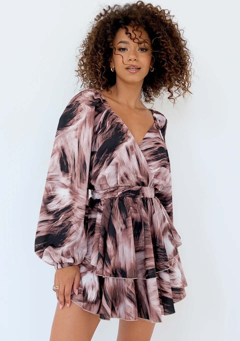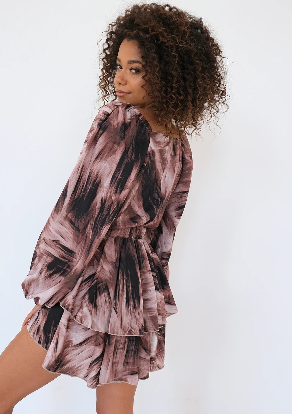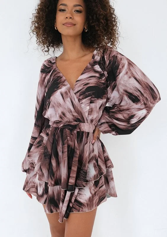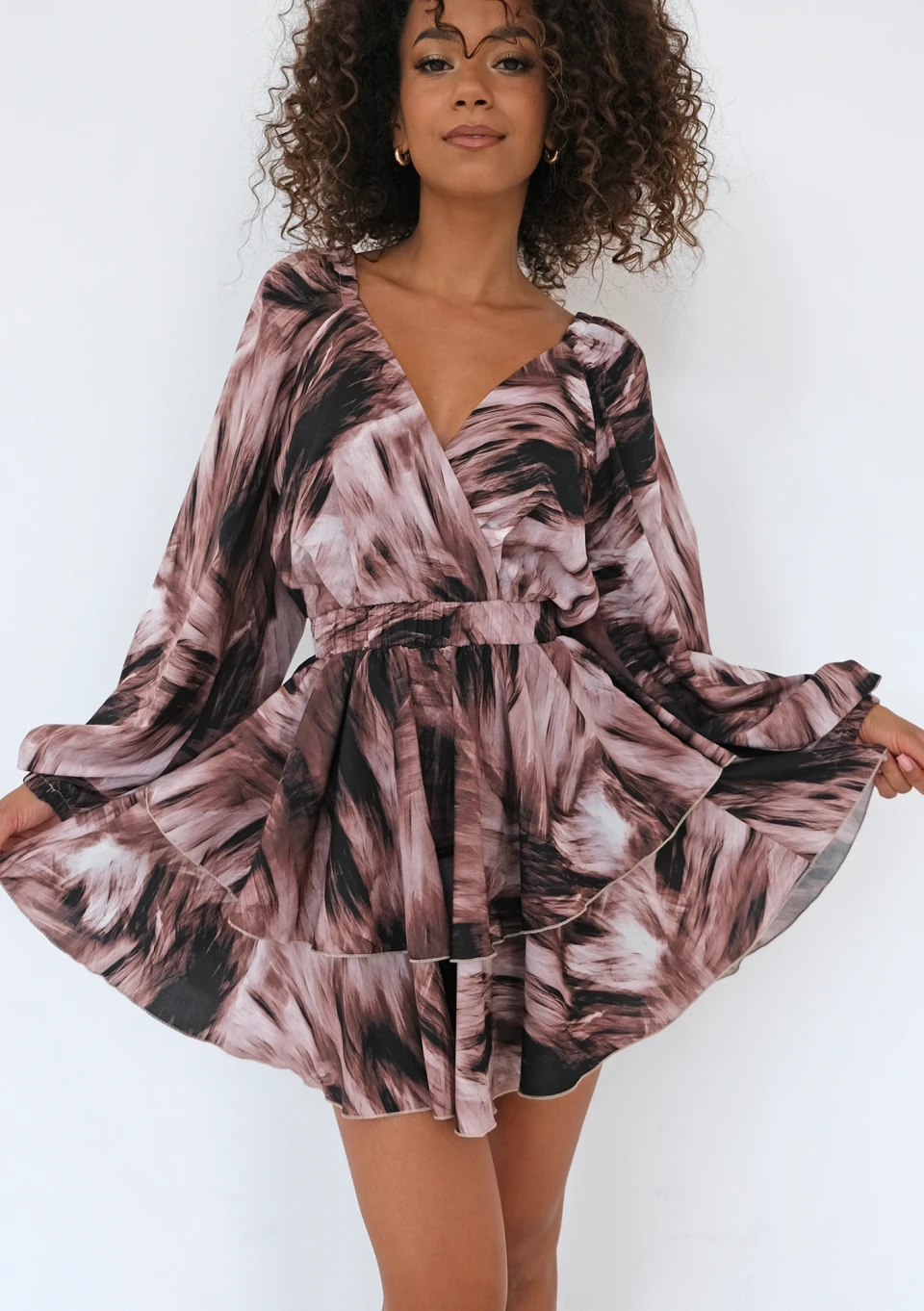 Rozkloszowana sukienka mini z kopertowym dekoltem i długim rękawem. Kreacja zachowana w jesiennej kolorystyce brązu.