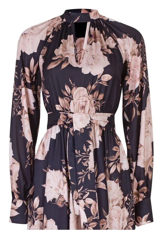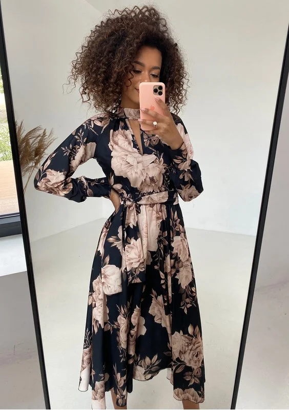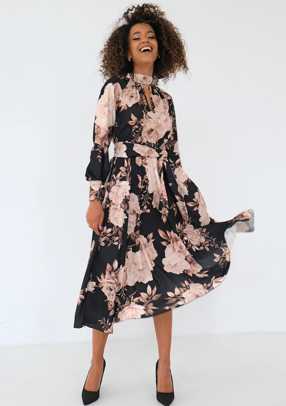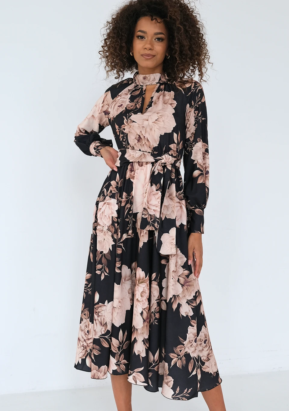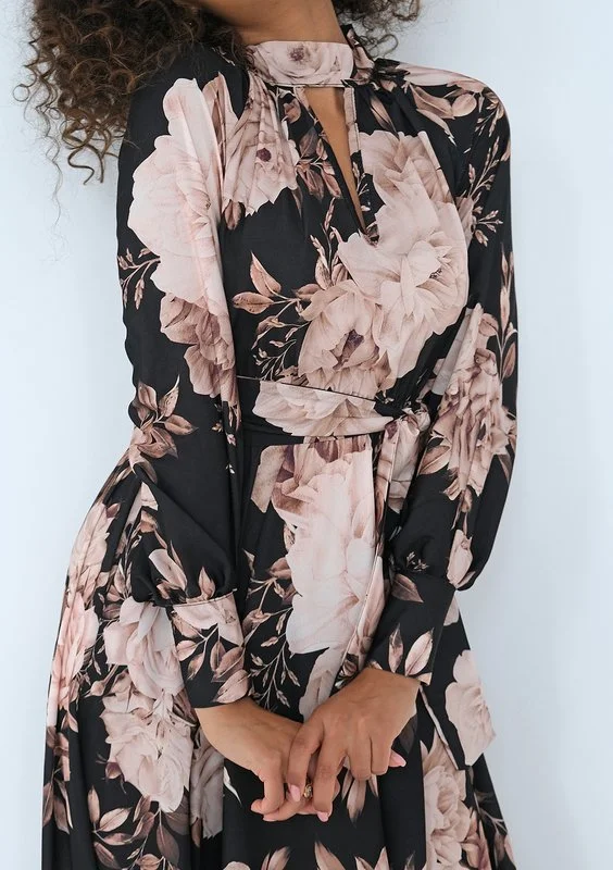 Elegancka, czarna sukienka midi w kwiaty to piękna kreacja na chłodny sezon. Będzie Ci w niej wygodnie w pracy, podczas ważnych spotkań i uroczystości. Model przyciąga uwagę modnym wycięciem pod stójką dekoltu.