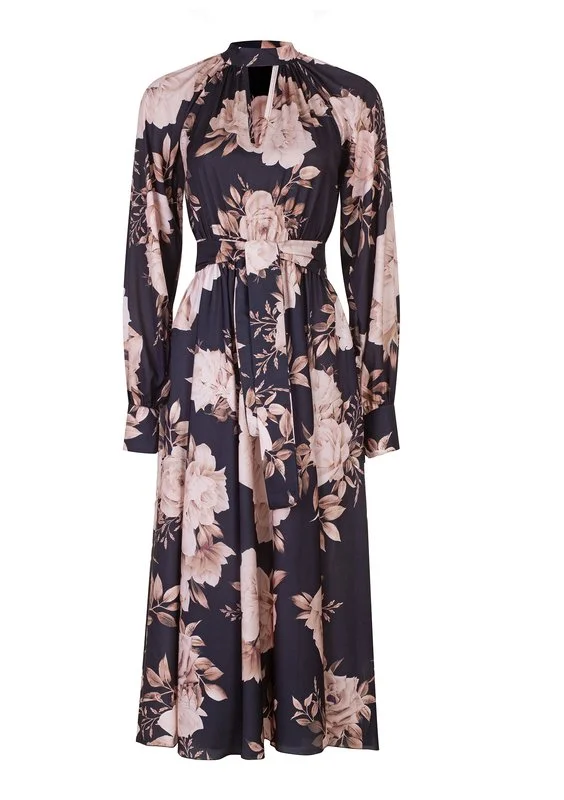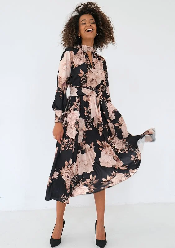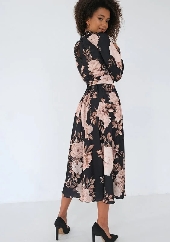 Florence - Koktajlowa sukienka midi w kwiaty Czarna