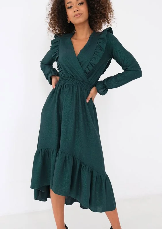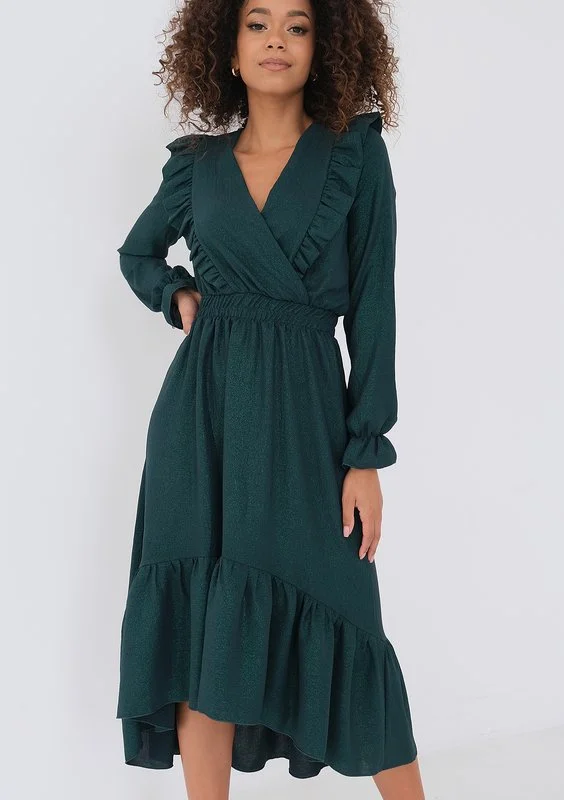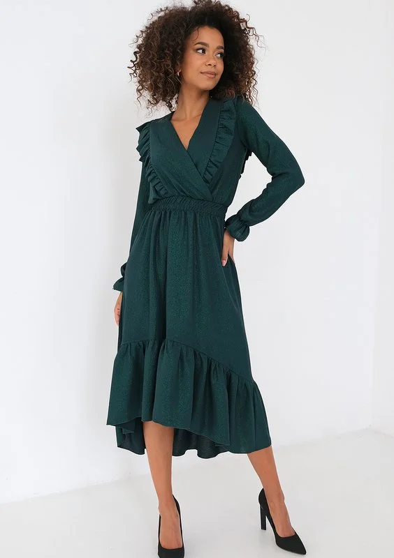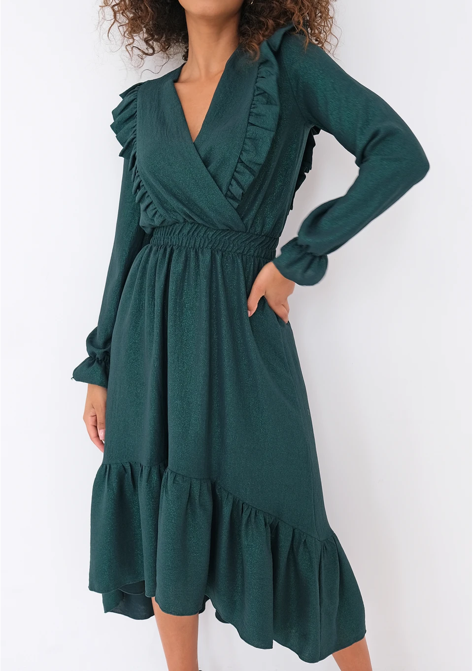 Wygodna sukienka midi na najróżniejsze okazje. Model w pięknej zieleni, zachowuje kobiecy styl dzięki licznym falbankom. Zmysłowości dodaje kopertowy dekolt. Została wykonana ze zwiewnej tkaniny o pięknie skrzącej się fakturze.