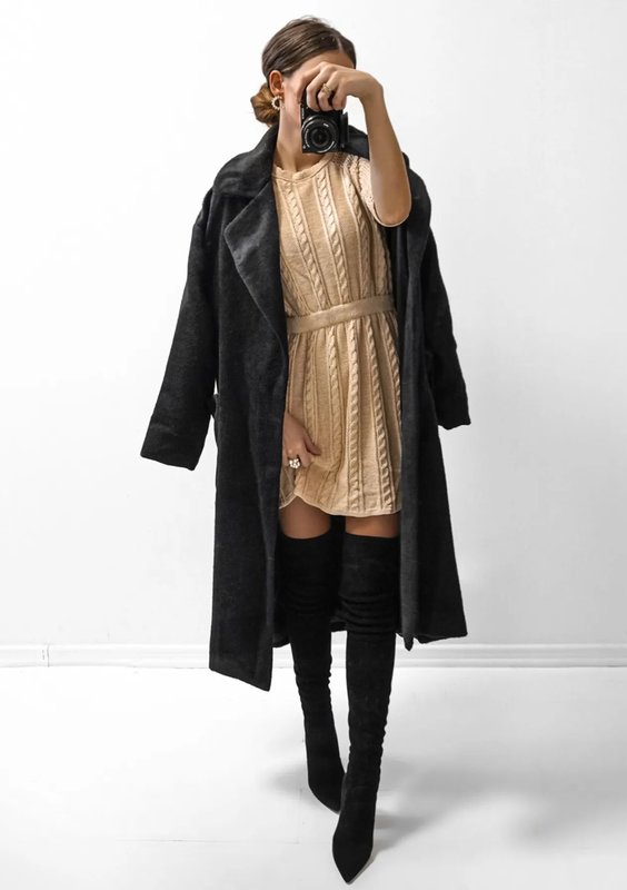 Krótka sukienka dzianinowa w delikatnym beżu. Zaskakuje pięknymi splotami i ażurem na rękawach. Ta subtelna kompozycja przykuwa uwagę do walorów sylwetki, szczególnie eksponując nogi i talię.