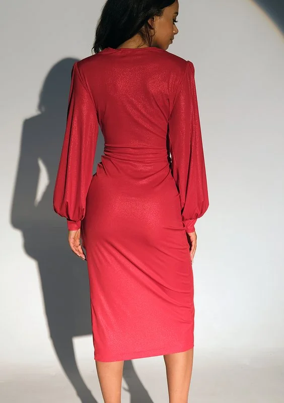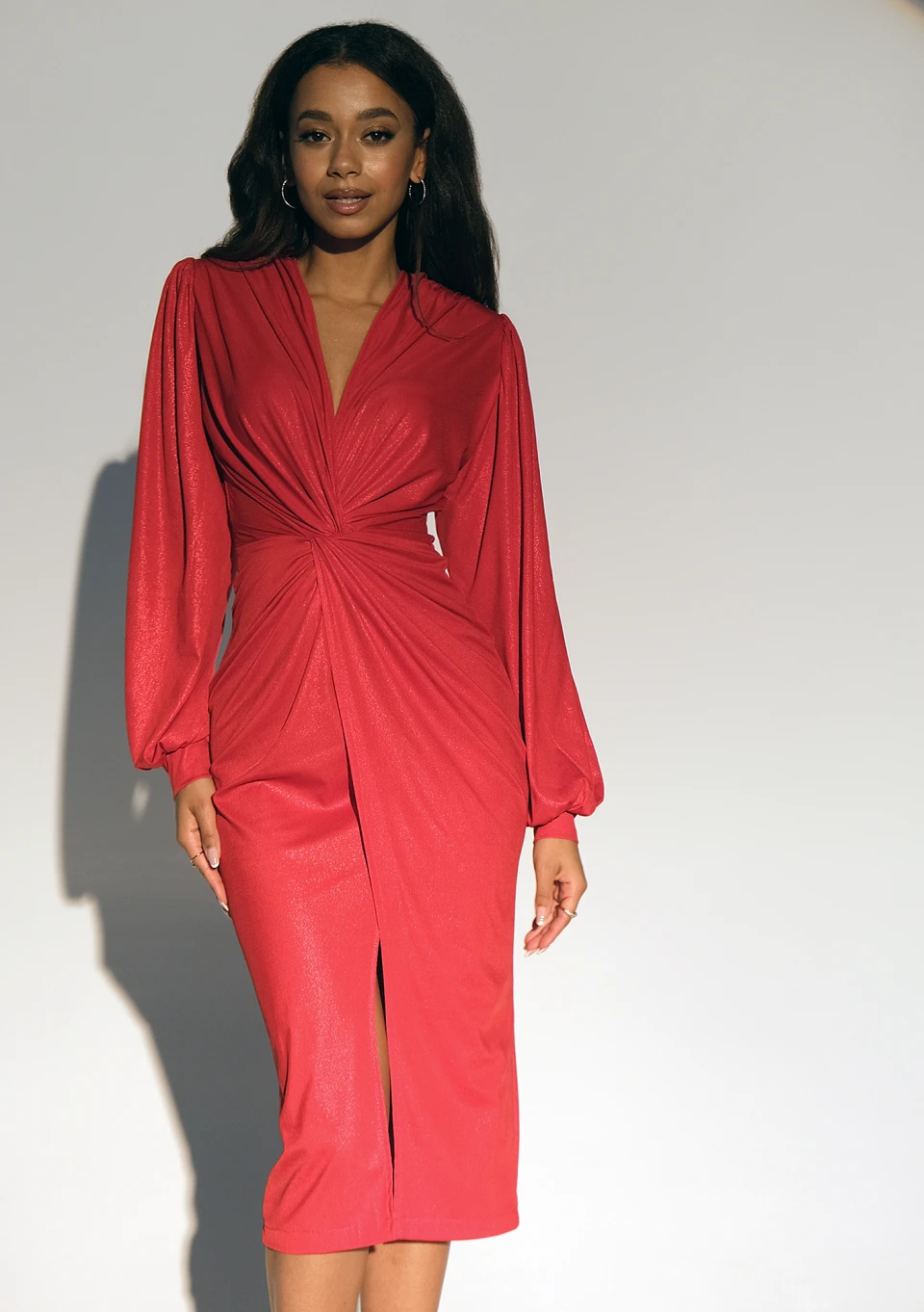 Czerwona sukienka midi sprawi, że będziesz wyglądać oszałamiająco i niezwykle elegancko. Model ponętnie opina sylwetkę, a centralna draperia doskonale wysmukla talię.