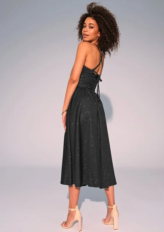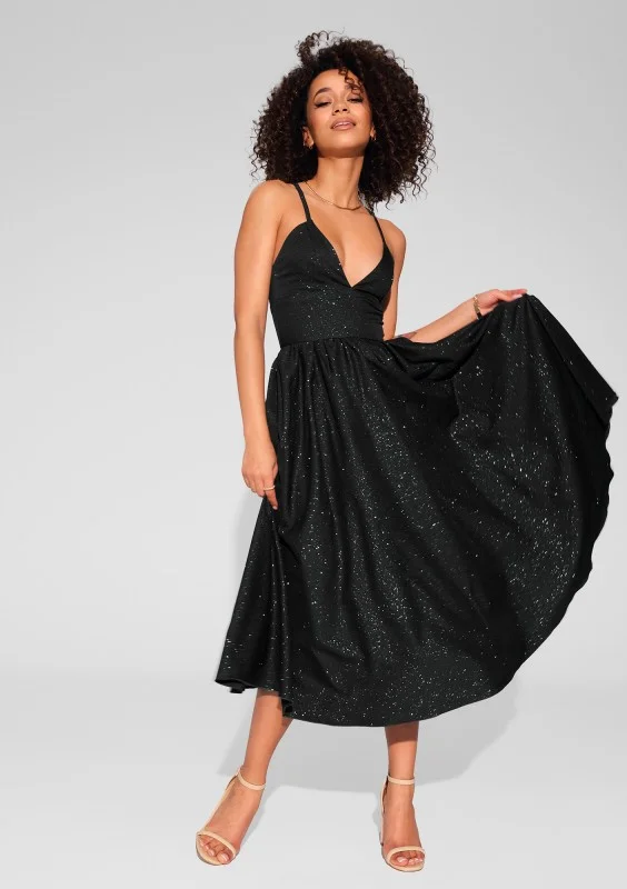 Czarna sukienka midi to olśniewająca kreacja wieczorowa, w której poczujesz się luksusowo, pięknie i zmysłowo. Model skrzy dzięki brokatowym drobinkom.
