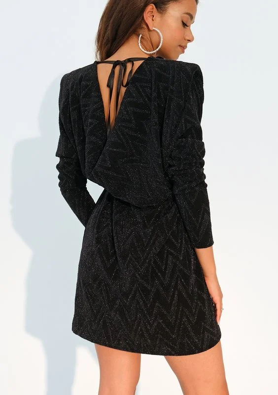 Czarna sukienka wieczorowa z poduszkami i subtelną ekspozycją pleców. Pięknie skrzący materiał zdobi wzór jodełki.