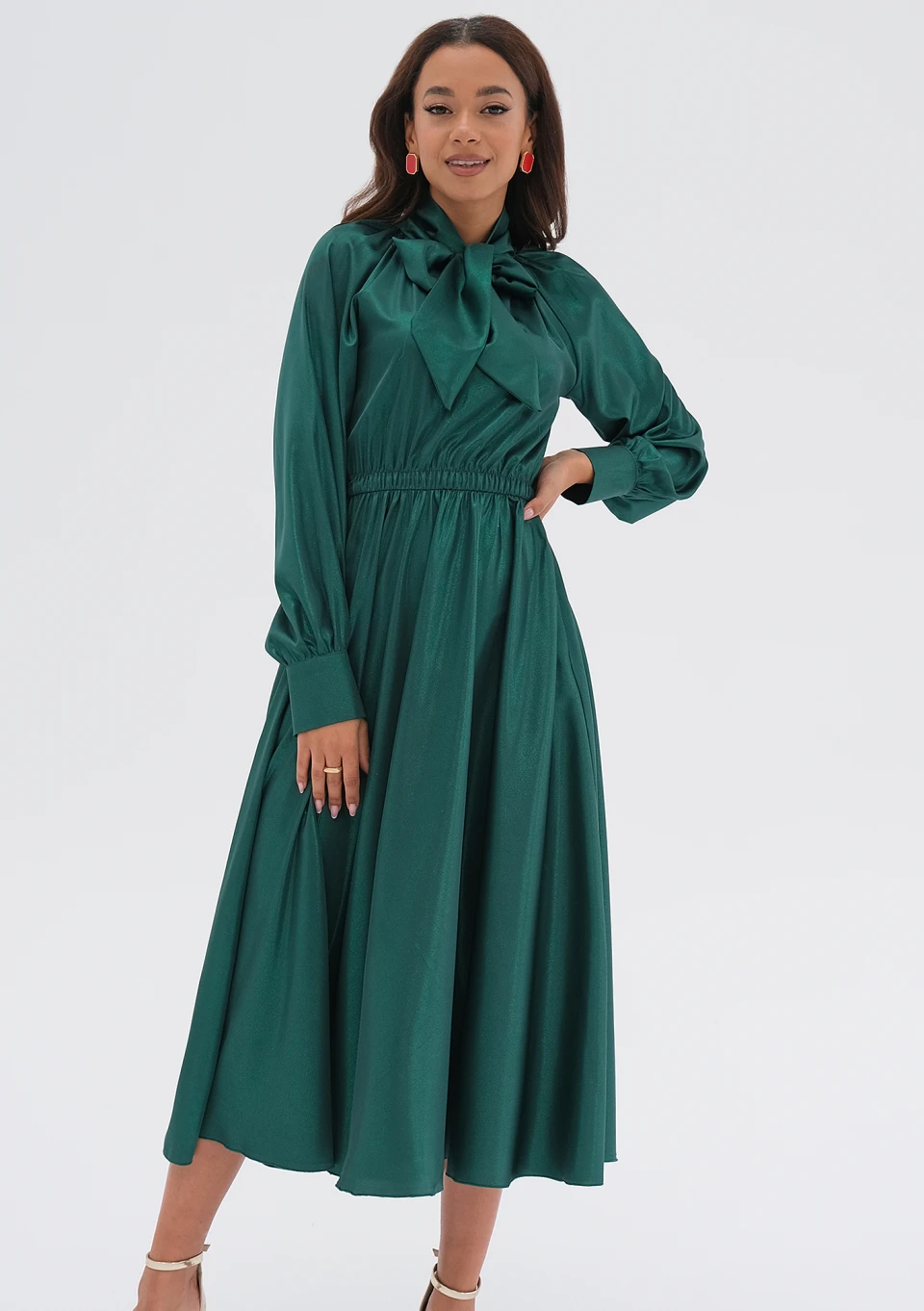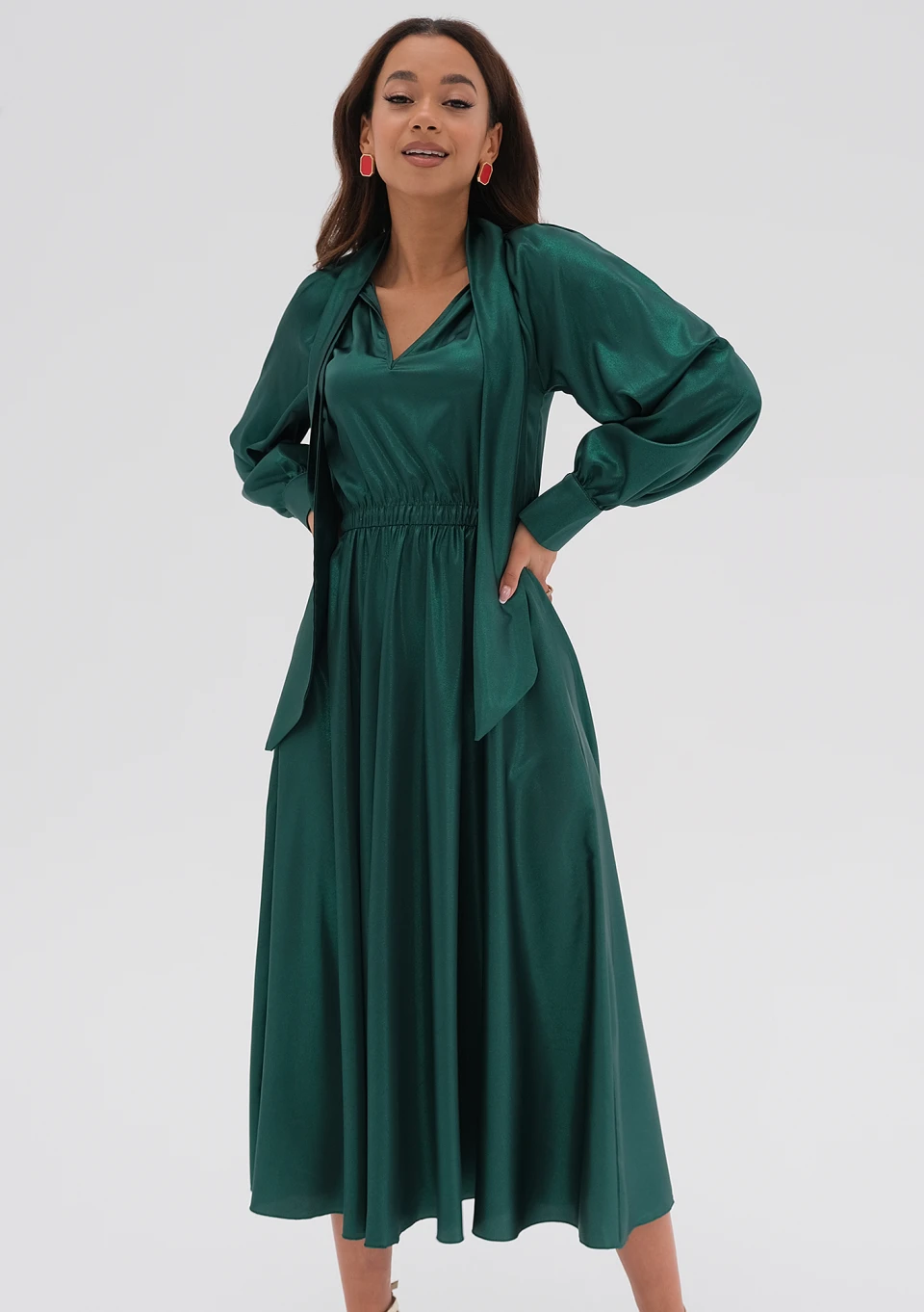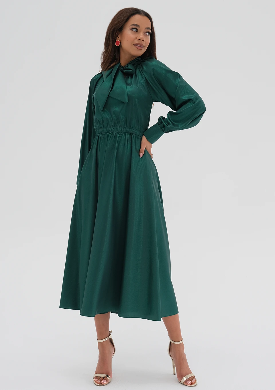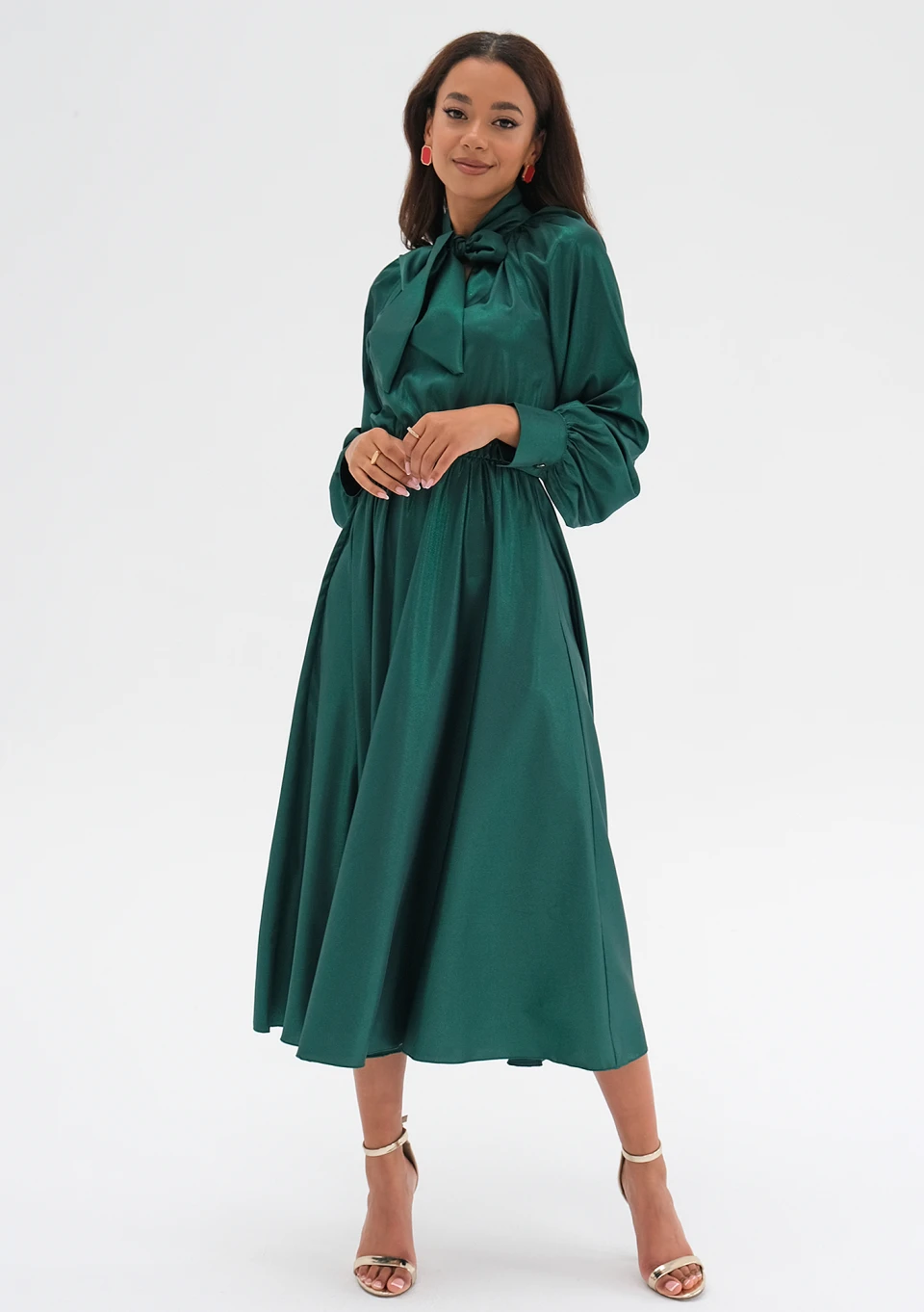 Zielona sukienka midi zachwyca głębią koloru i połyskiem satyny. Mocno rozkloszowana, podkreśla talię gumką. To kreacja z eleganckim wiązaniem i dekoltem w serek.