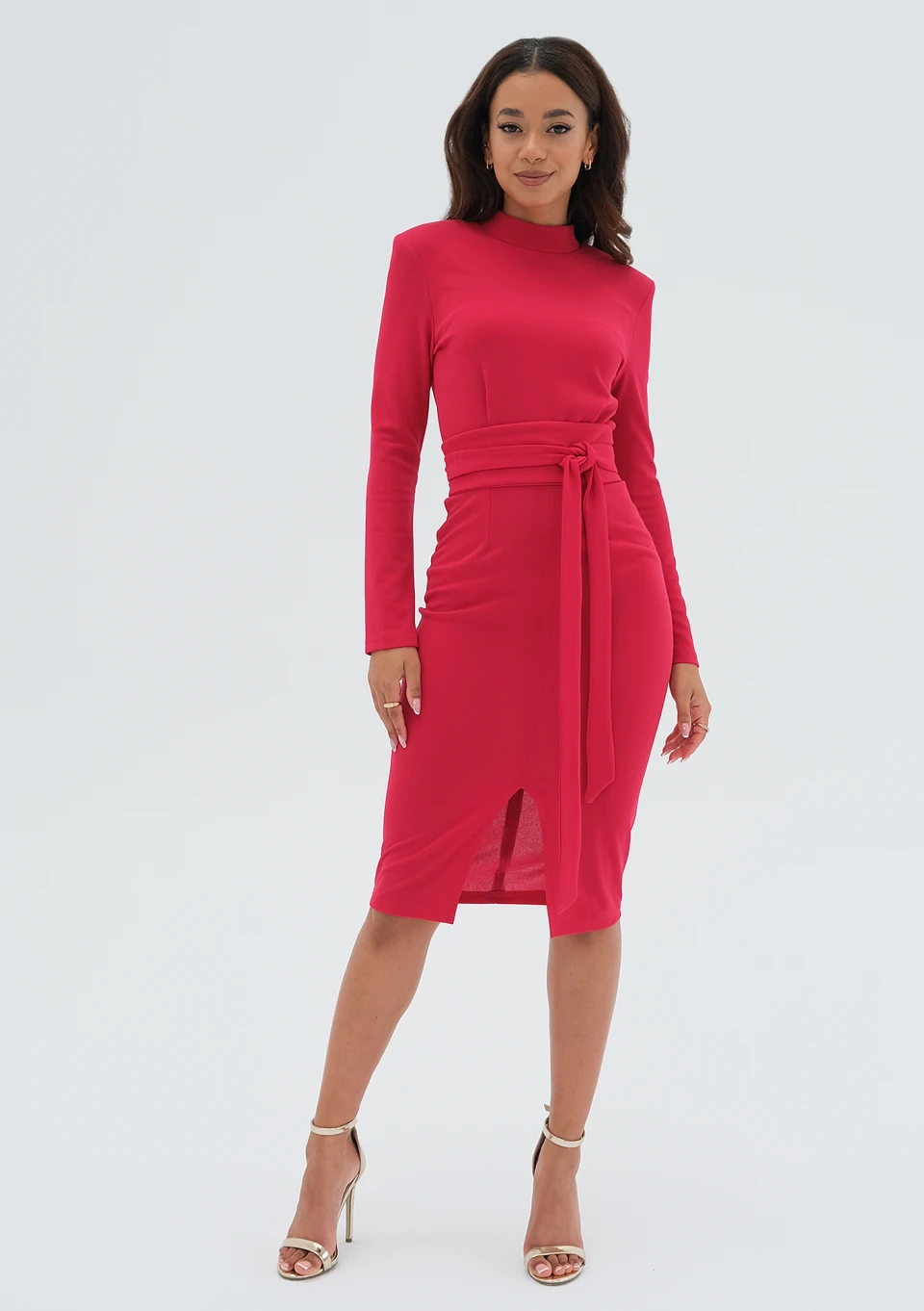 Ołówkowa sukienka midi w amarantowym różu. Zapewnia piękny zarys sylwetki, tworzy elegancki i nieprzesadzony kant ramion dzięki poduszkom. Całość dopełniona efektownym wiązaniem i zmysłowym rozcięciem.