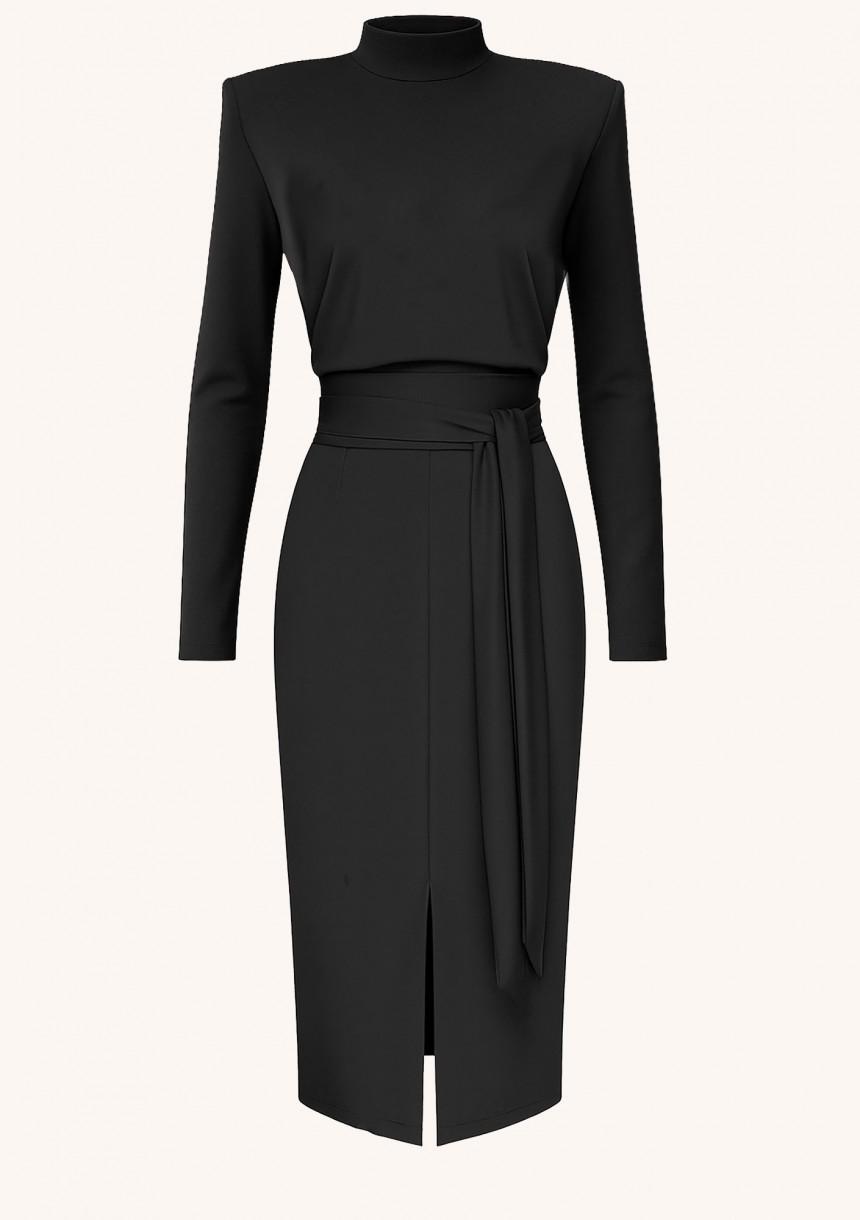 Czarna sukienka ołówkowa o długości midi. Zapewnia piękny zarys sylwetki, tworzy elegancki i nieprzesadzony kant ramion dzięki poduszkom. Elegancko dopełniona wiązaniem i zmysłowym rozcięciem.