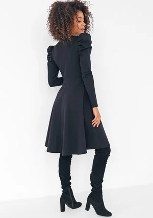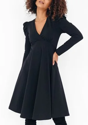 Wiele kobiet doskonale czuje się w eleganckiej czerni. Proponujemy więc model, który jest wszechstronny i pasuje zarówno na oficjalne wyjścia, jak i prywatne spotkania. Rozkloszowany krój nie krępuje ruchów, a koperta dekoltu nadaje całości smaku. Czarna kreacja cudnie poprawia proporcje: jest to sukienka odcinana pod biustem, a więc maskuje krągłości sylwetki, a także można w niej pomieścić ciążowy brzuch. Taki krój przynosi wiele korzyści, szczególnie pełnej sylwetce lub o typie gruszki. Luźne, rozkloszowane sukienki midi tuszują krągłe uda i szerokie biodra. Została ozdobiona przy rękawach: romantyczne marszczenia na kształt bufek wyrównują proporcje wąskich ramion. Prezentowana kreacja pasuje jako element szykownego ubioru do pracy, pod marynarkę lub długi kardigan. Zachowana w jednolitej czerni doskonale zagra z najróżniejszą oprawą dodatków. To polska sukienka projektu Alicji Komar, wykonana w rodzimej pracowni w rozmiarach XS – L.