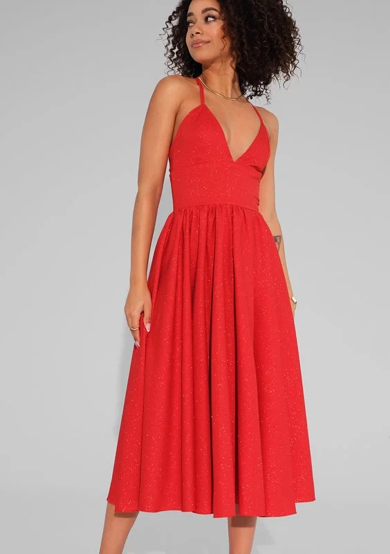 Olśniewająca sukienka wieczorowa midi w zmysłowej, błyszczącej czerwieni. Na zjawiskowy efekt pracuje rozkloszowana forma z ponętnym dekoltem na ramiączkach.