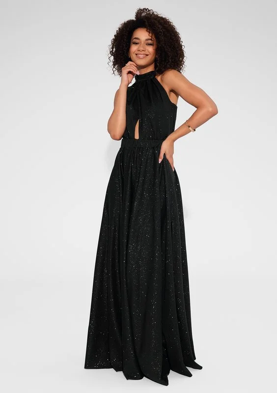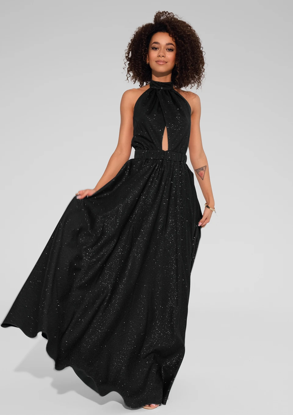 Wieczorowa sukienka maxi w brokatowej czerni. Zmysłowy krój odsłania plecy, ramiona, a także okolice talii, dzięki kopertowemu ułożeniu tkaniny na dekolcie.