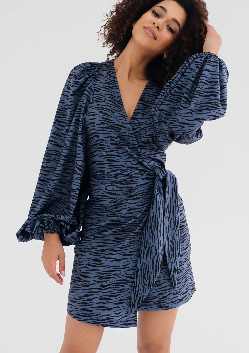 Fason mini, kopertowy, wiązaniem w talii i długim, luźnym rękawem.