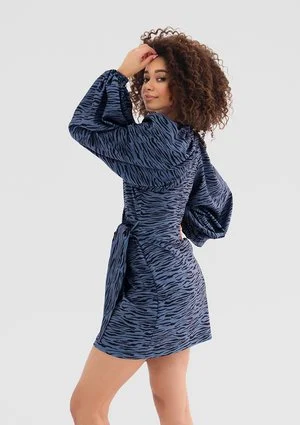 Zgłoś nielegalną treśćNiebieska sukienka kopertowa mini w zeberkę to zaskakująca kreacja w sam raz na codzienne okazje. Została wykonana z miękkiej dzianiny, odpowiednio na chłodniejszą porę.