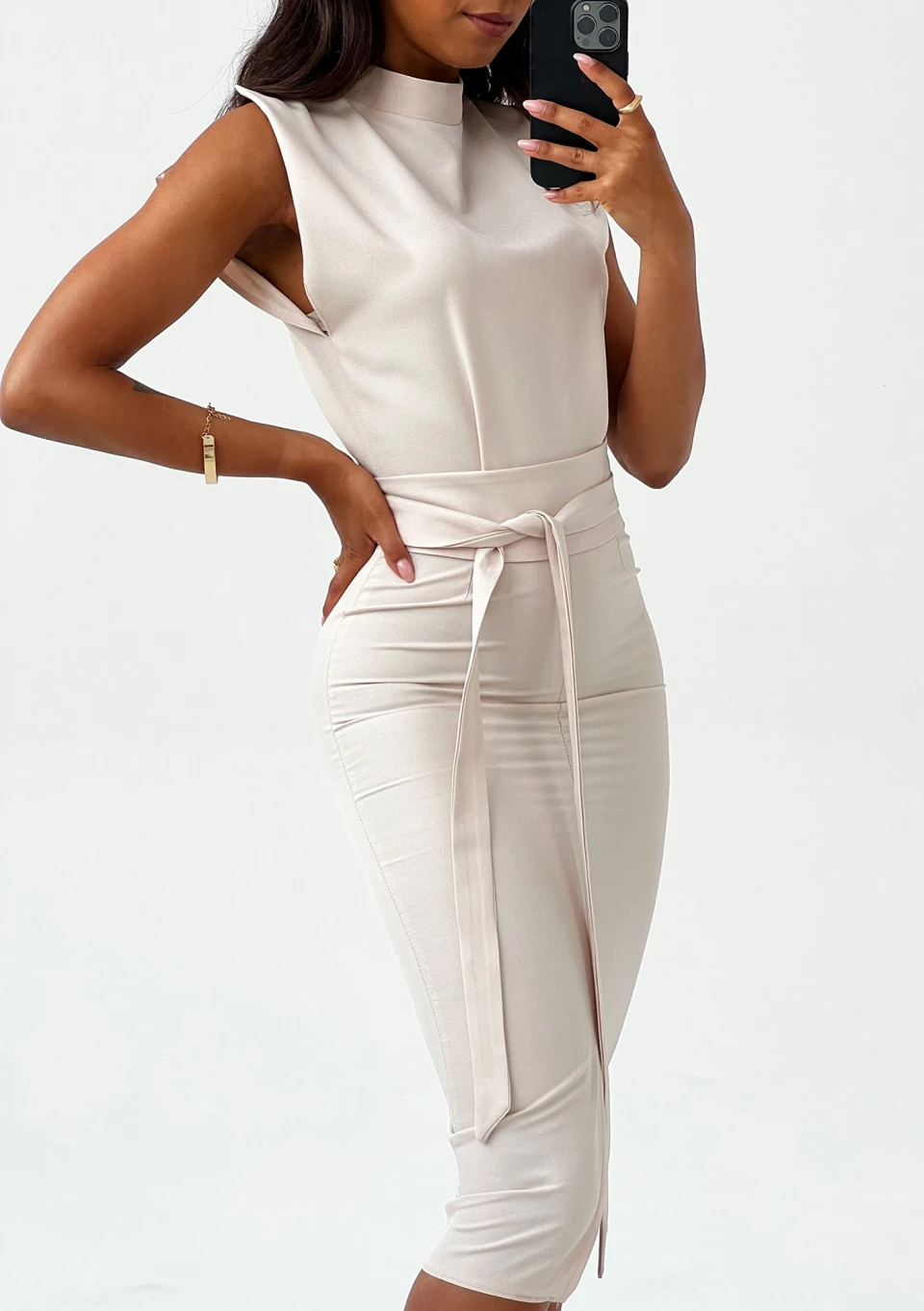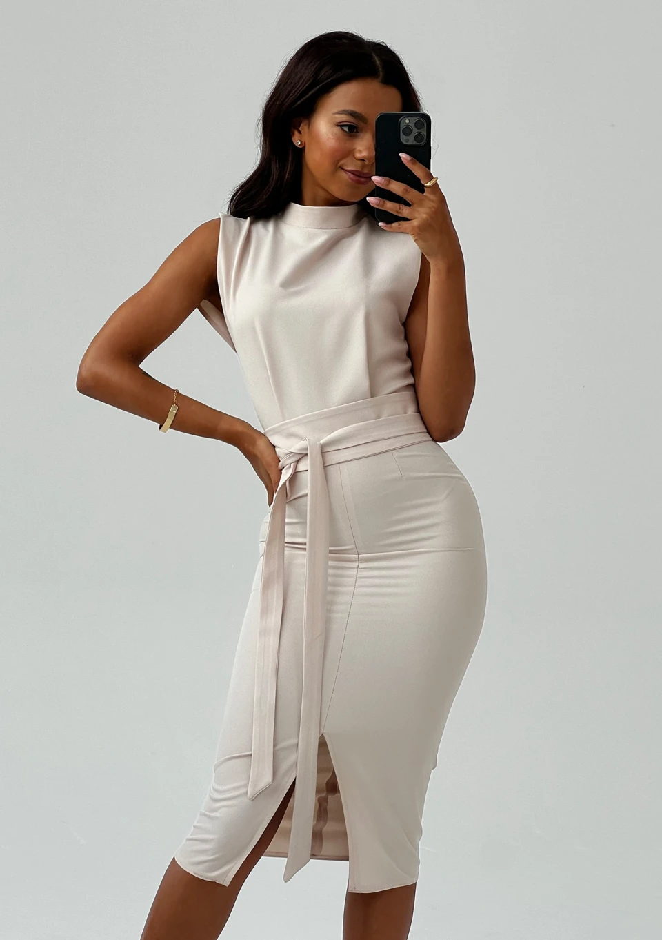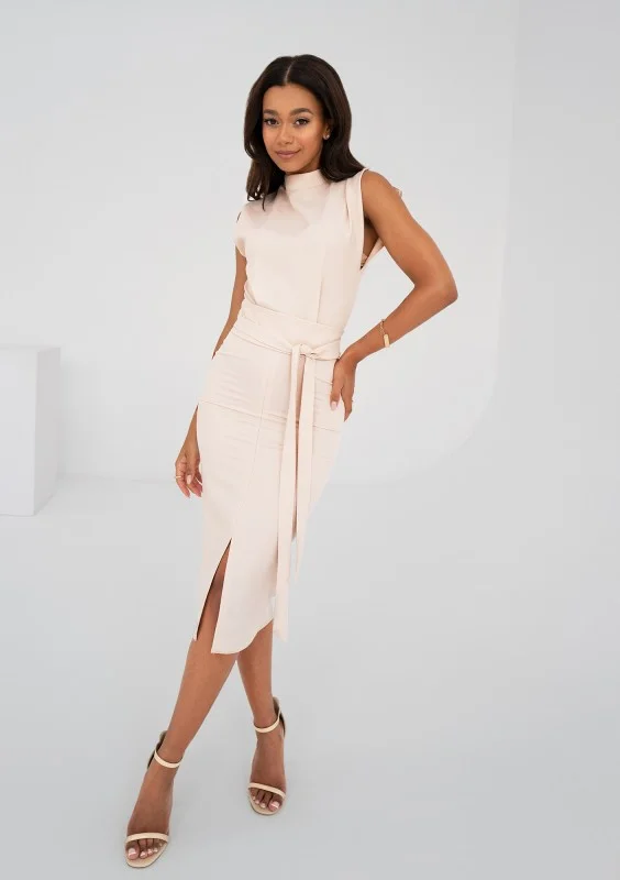 Ołówkowa sukienka midi w cielistym beżu. Elegancka i uniwersalna, posiada zabudowany dekolt, za to jej fason jest delikatnie rozcięty na dole. To model zapinany na zamek.