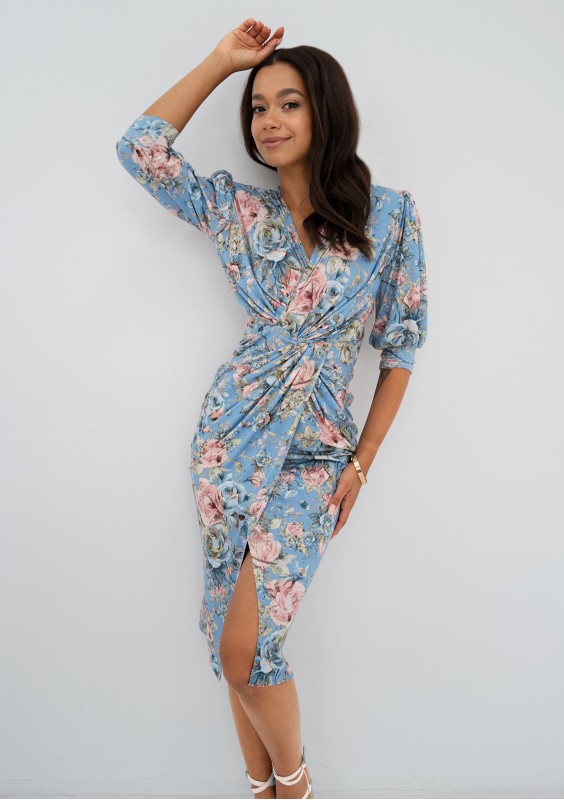 Wiosenna sukienka w kwiatki z efektowną draperią, poduszkami i bufkami.